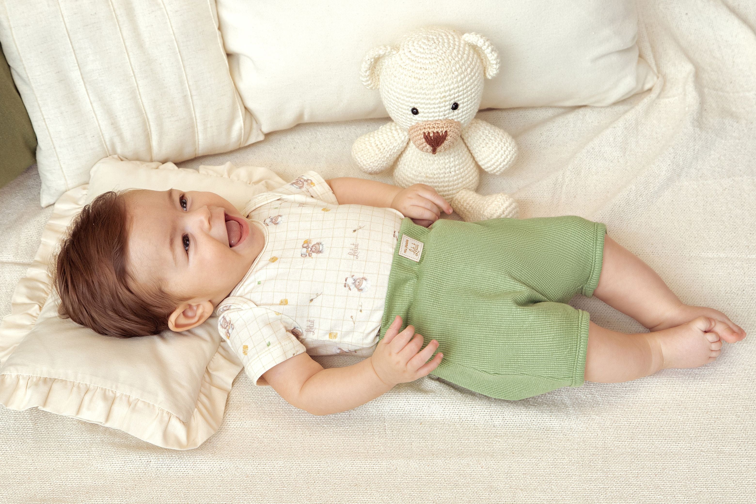 O destaque vai para o shorts em malha trabalhada quadriculada, levemente texturizada, com cós de elástico confortável e um bordado lúdico no bumbum, que proporciona um toque divertido e encantador ao look.