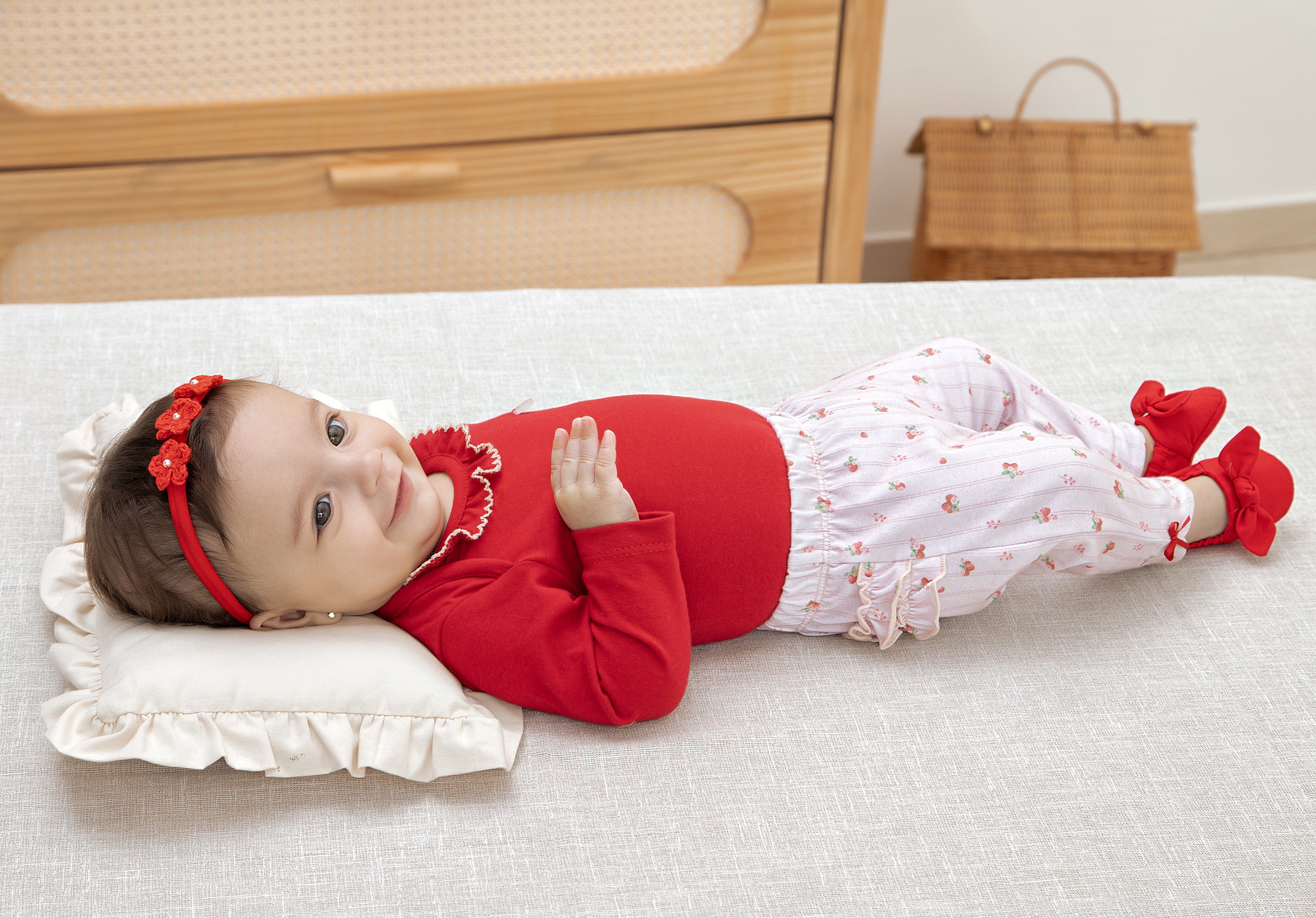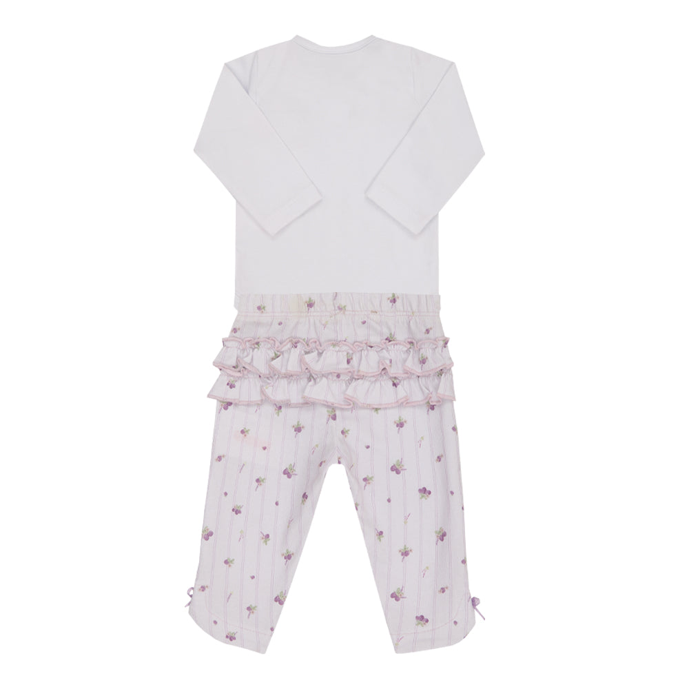 A calça estampada, também em malha conforto, tem cós traseiro de elástico, barrinha arredondada e um laço decorativo em cada lateral da perna, criando um visual gracioso e cheio de personalidade.
