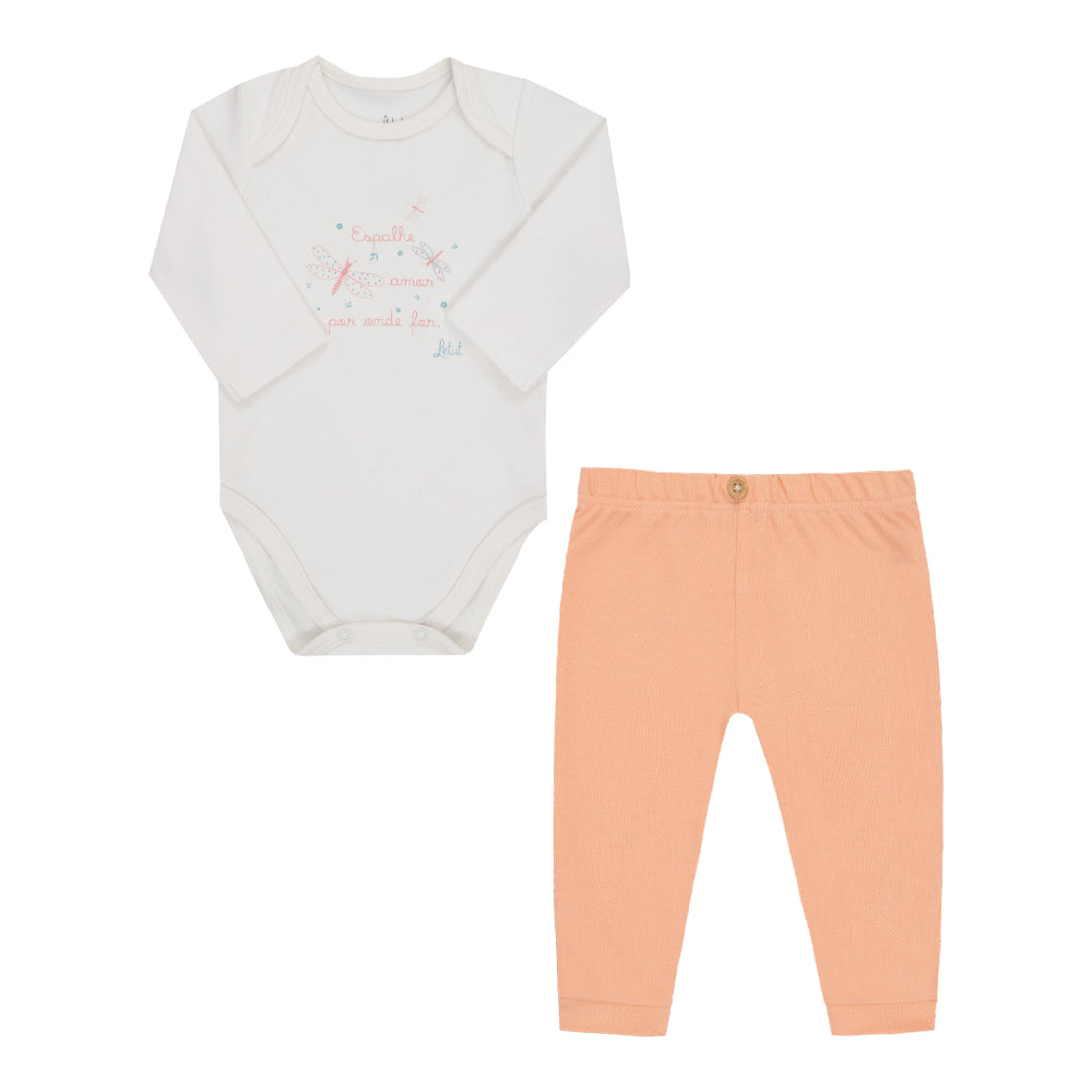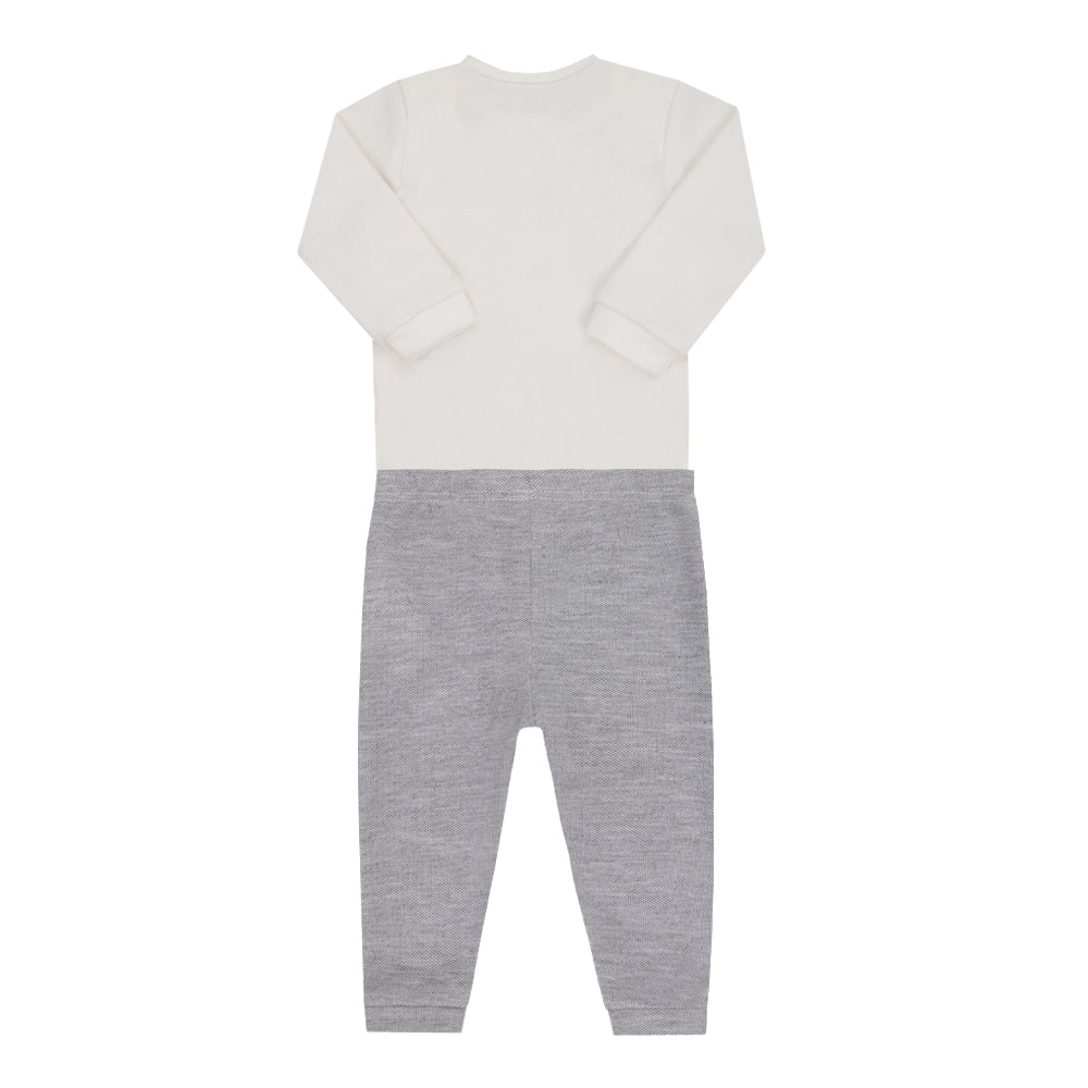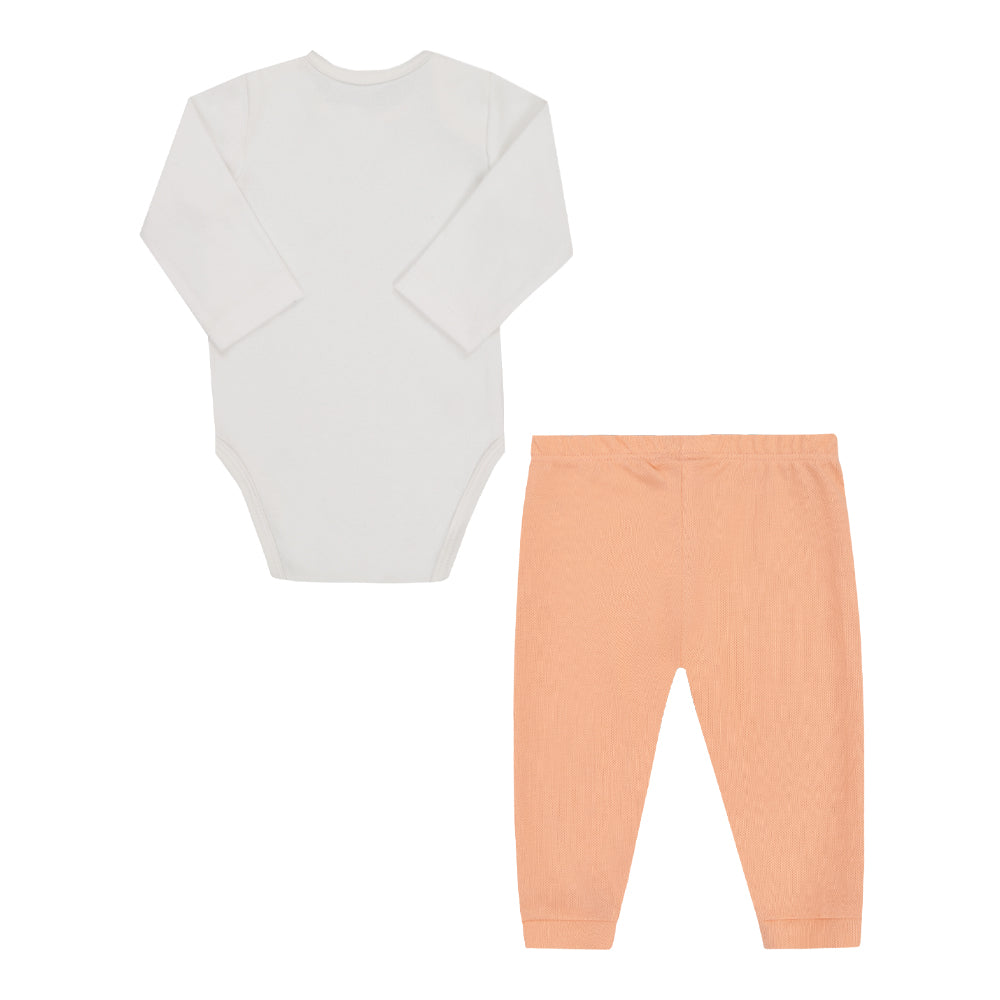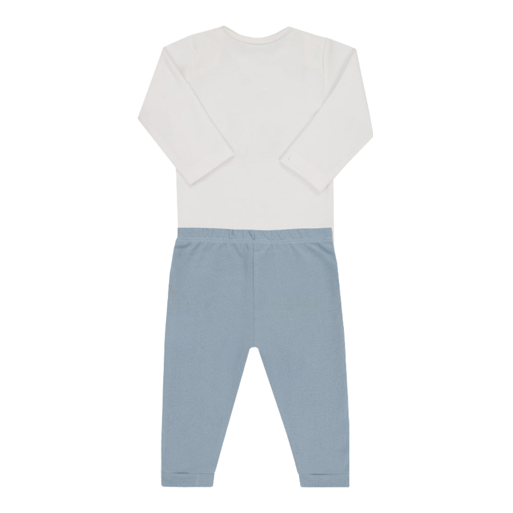 Conjunto longo baby com body em suedine 100% algodão, toque macio, gola expansível, detalhes estampados, abertura prática e calça em piquet levíssimo com elástico e botão decorativo.