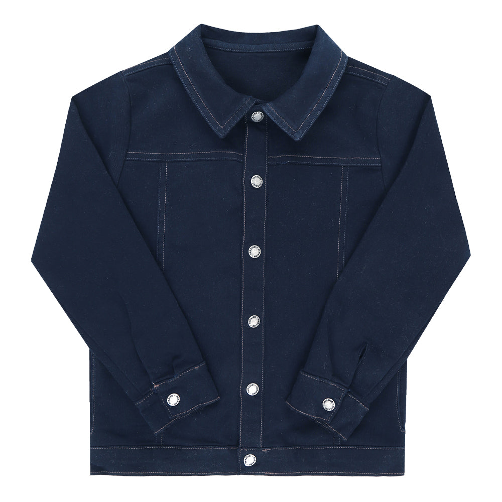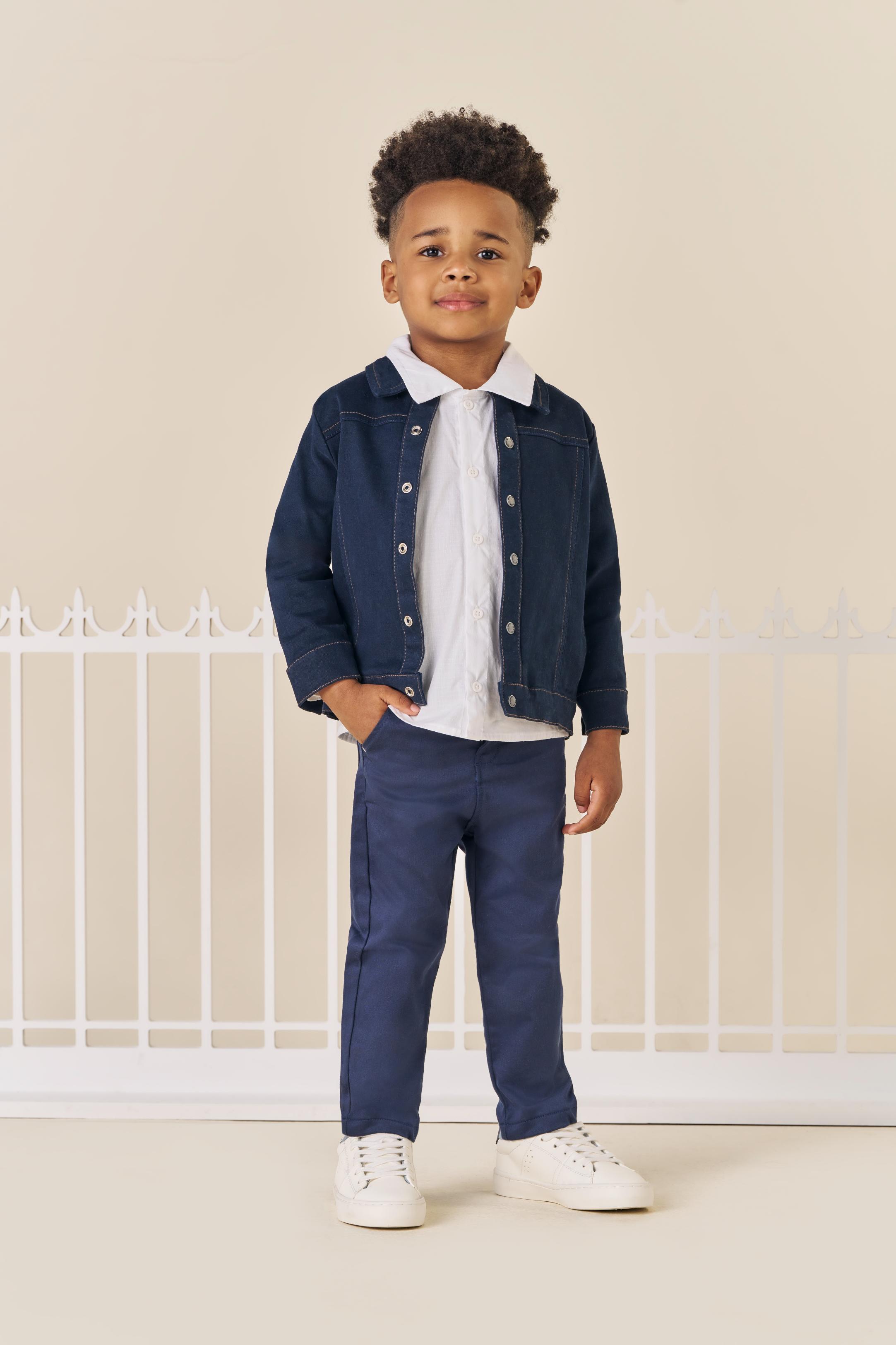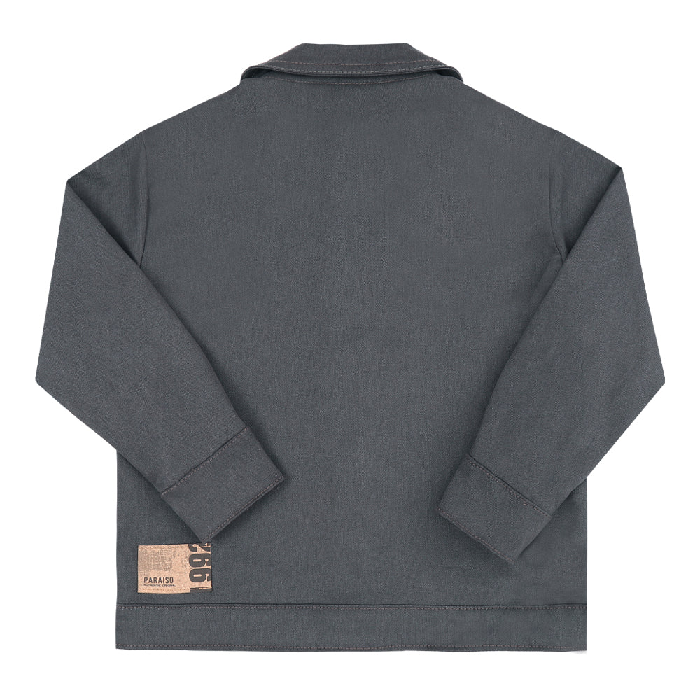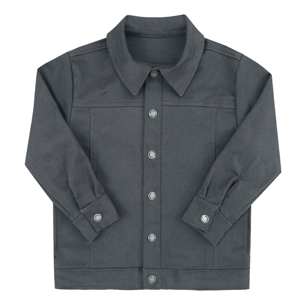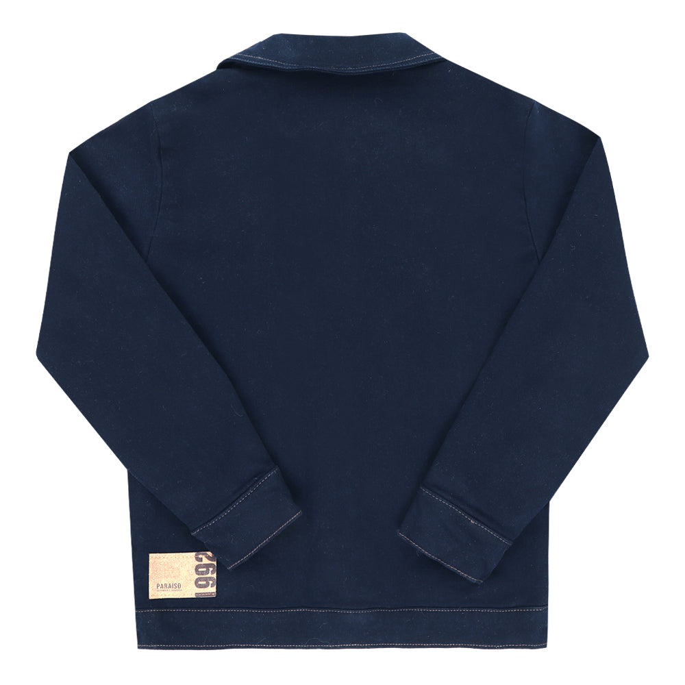 Jaqueta infantil masculina em sarja color levemente estruturada, com abertura frontal por botões de pressão, bolsos laterais funcionais, punhos estilo camisa e etiqueta da marca.