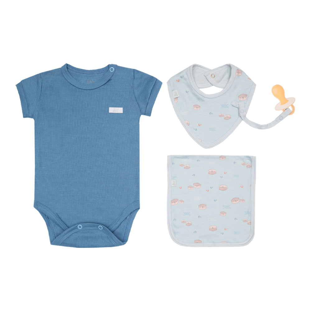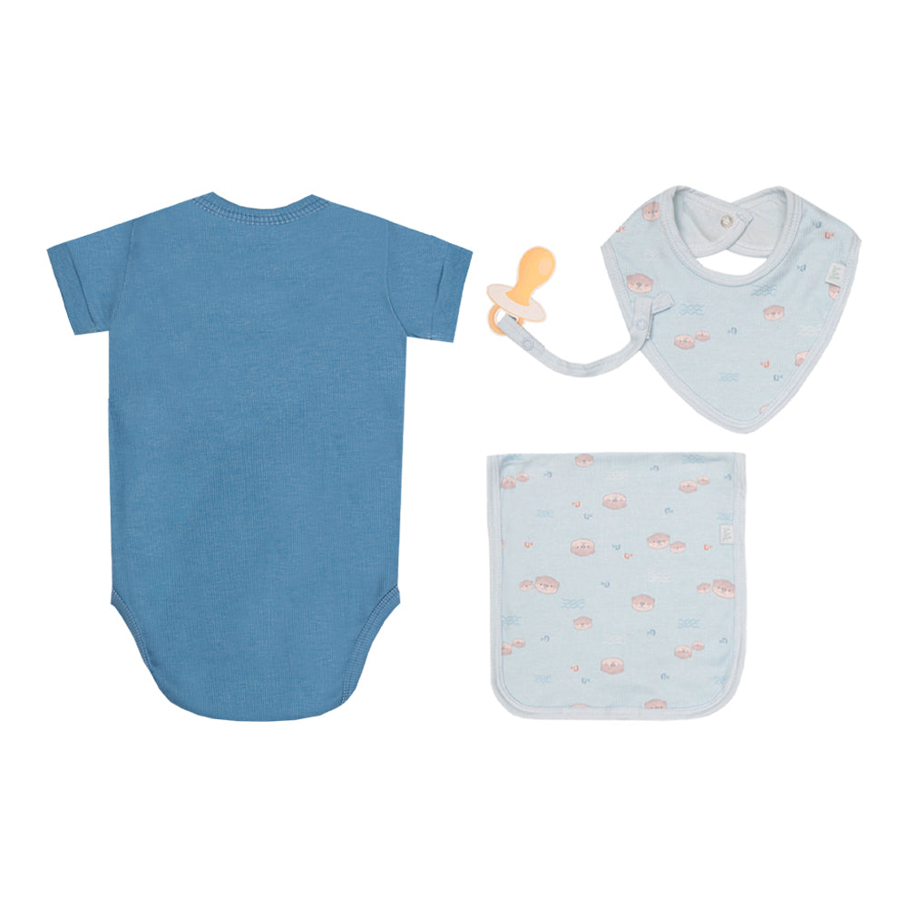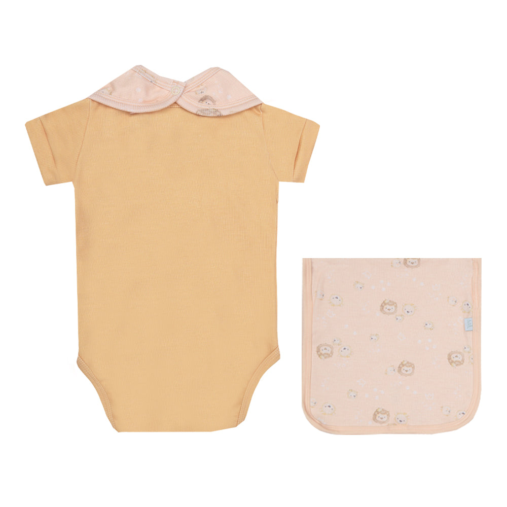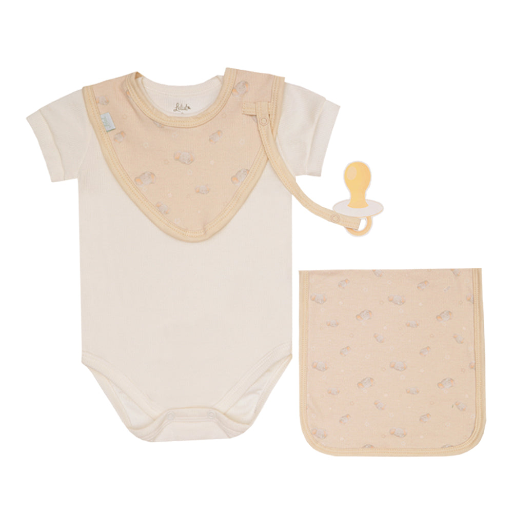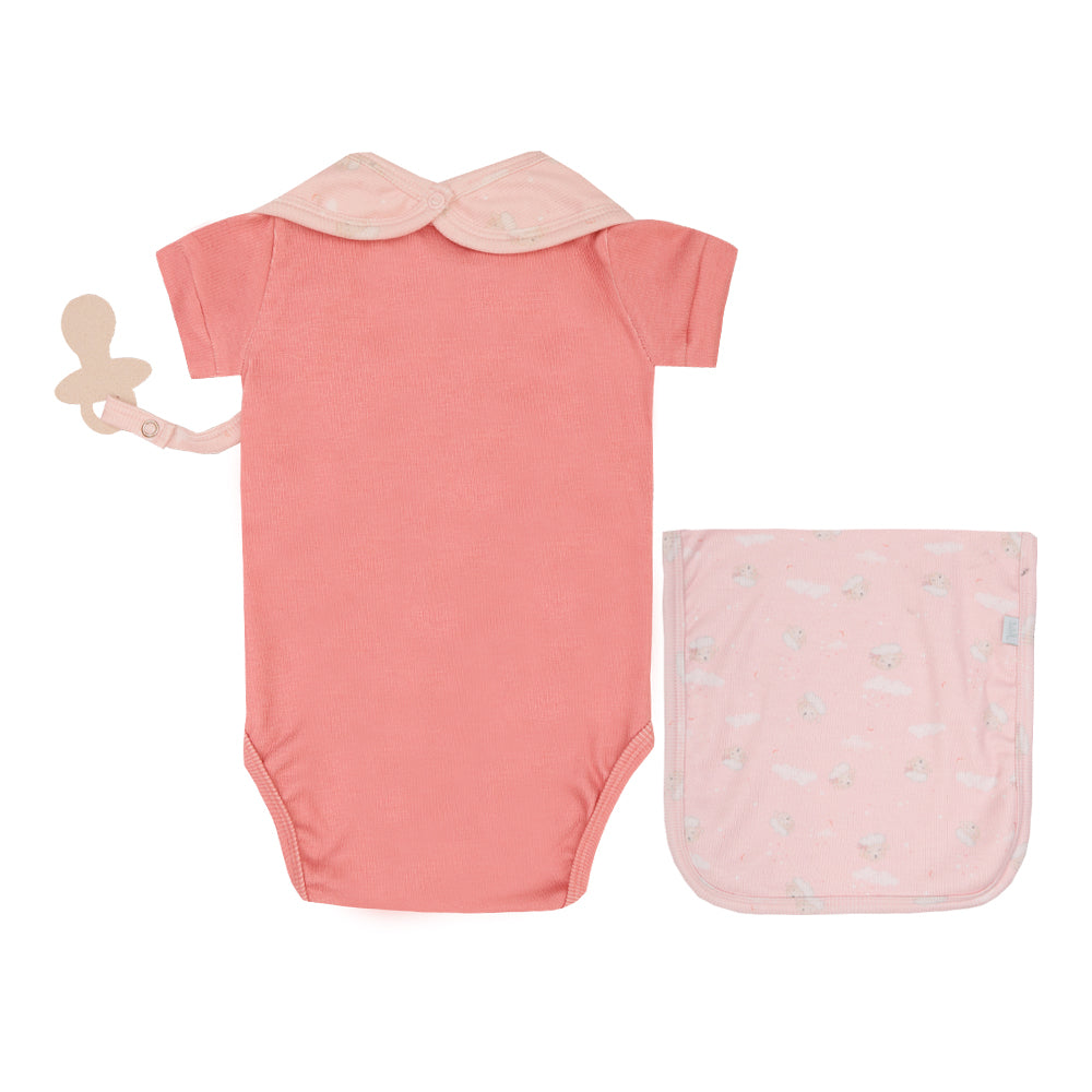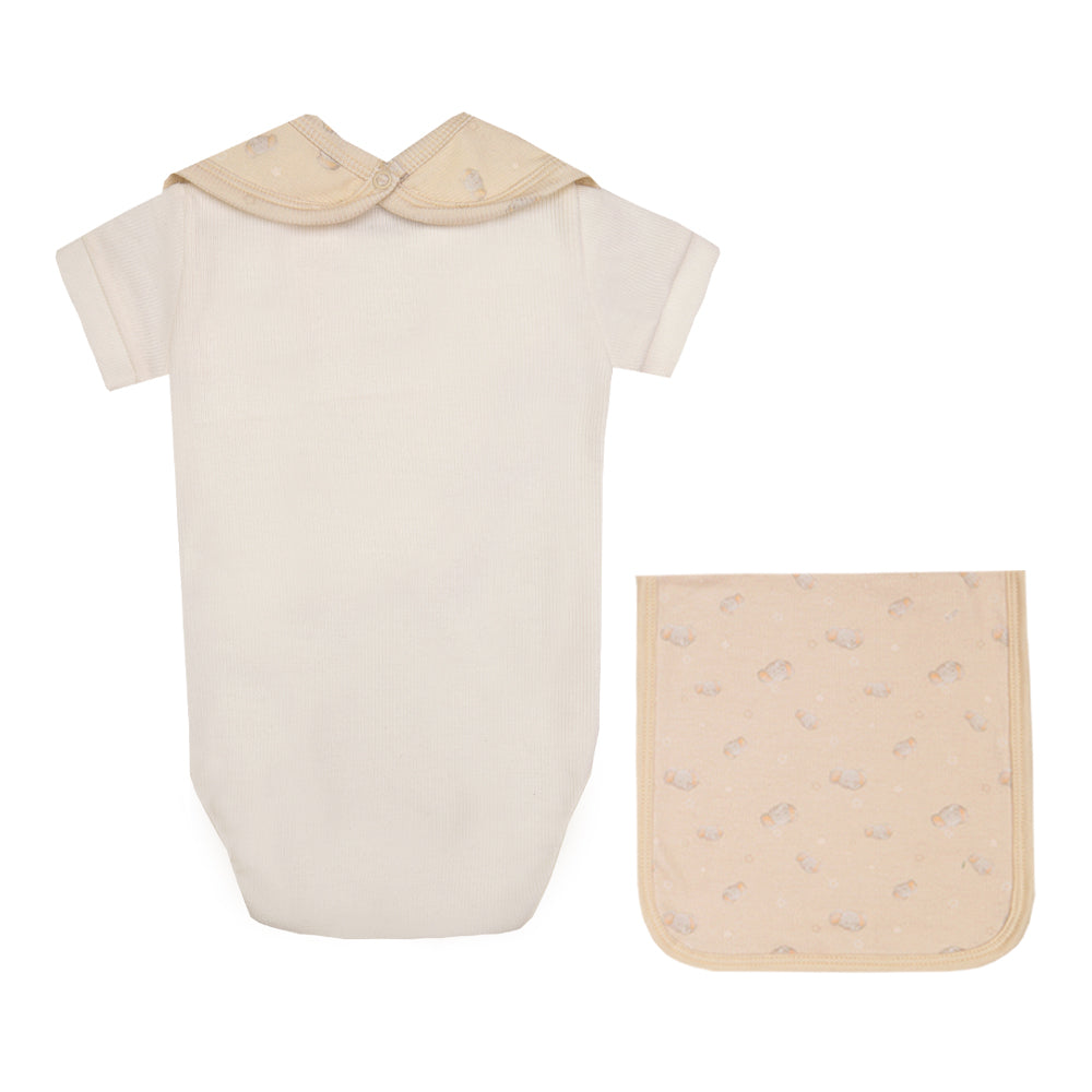Kit com body em malha ribana dolly, babador triangular com prendedor de chupeta e toalha de ombro forrada. Conforto e praticidade para o dia a dia do bebê, com charme e suavidade ao toque.