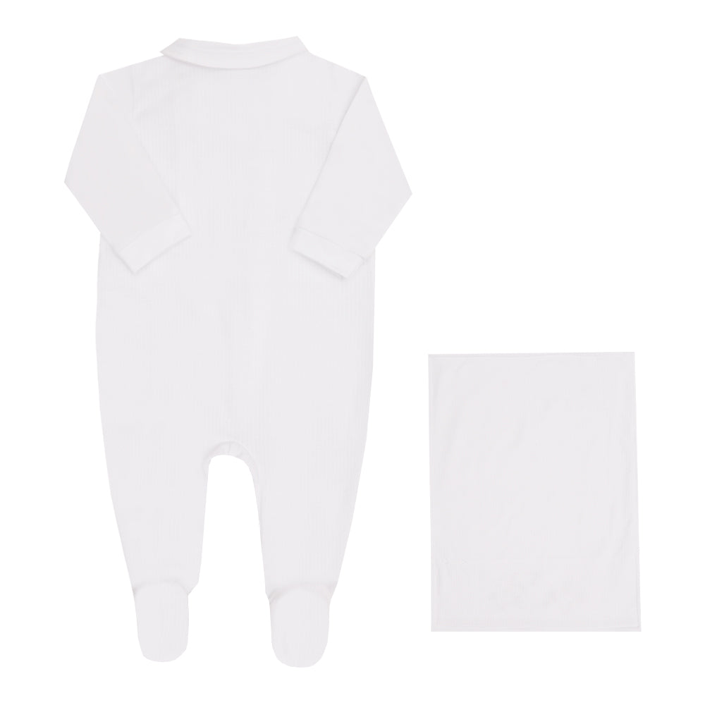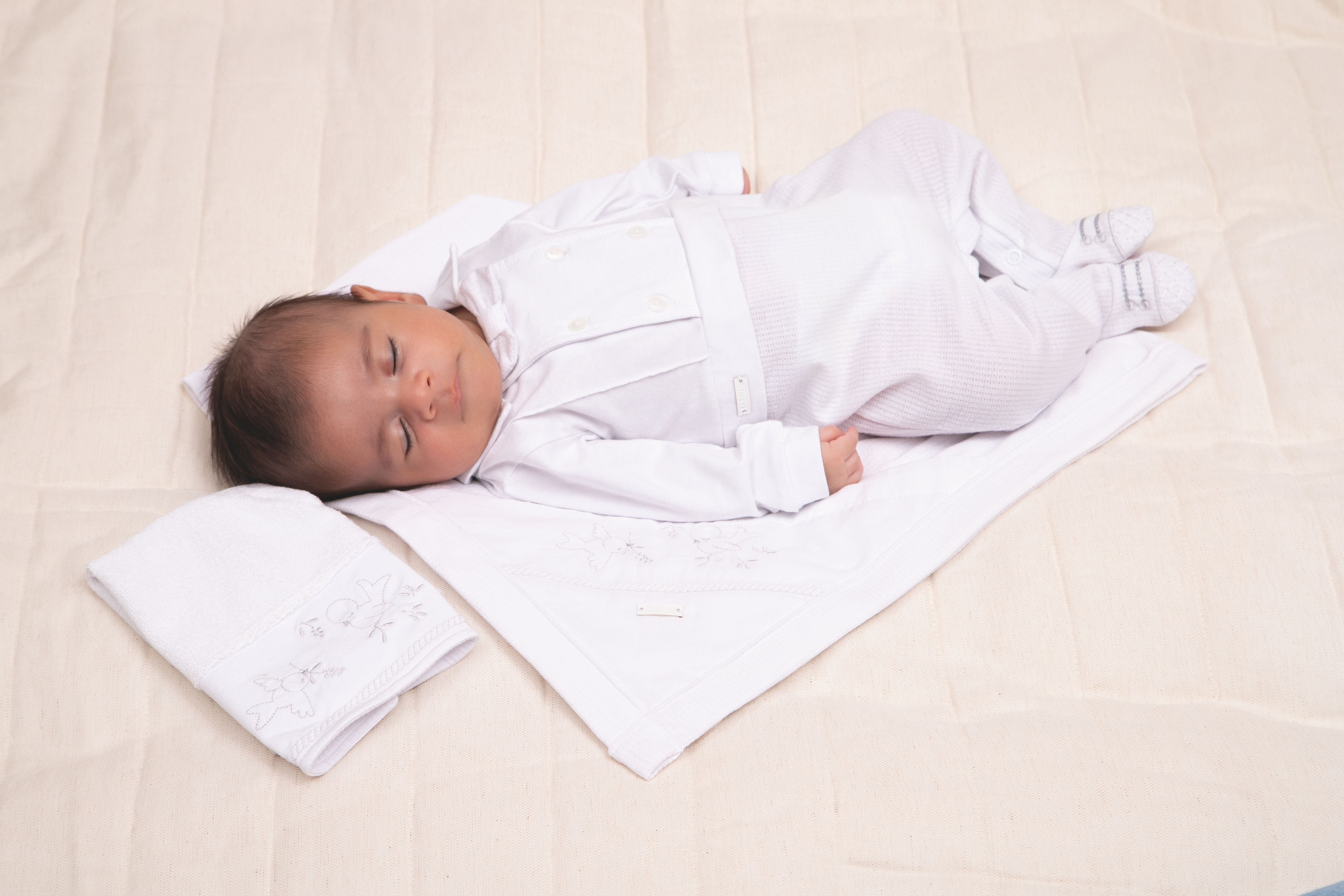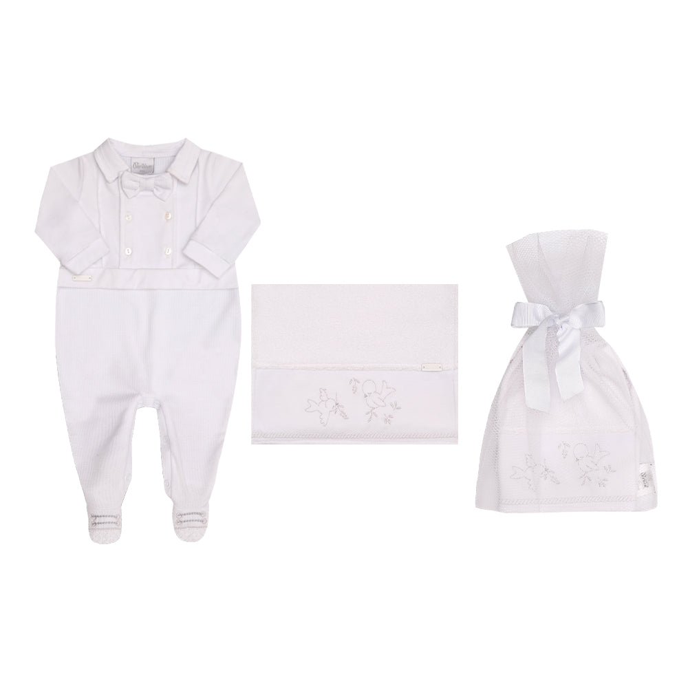 Com design clássico e acabamento refinado, o kit Linha Cerimônia Paraiso foi desenvolvido para tornar os momentos especiais ainda mais memoráveis. Acompanha macacão longo com pés, babita bordada e saquinho de tule, formando um conjunto elegante e funcional.