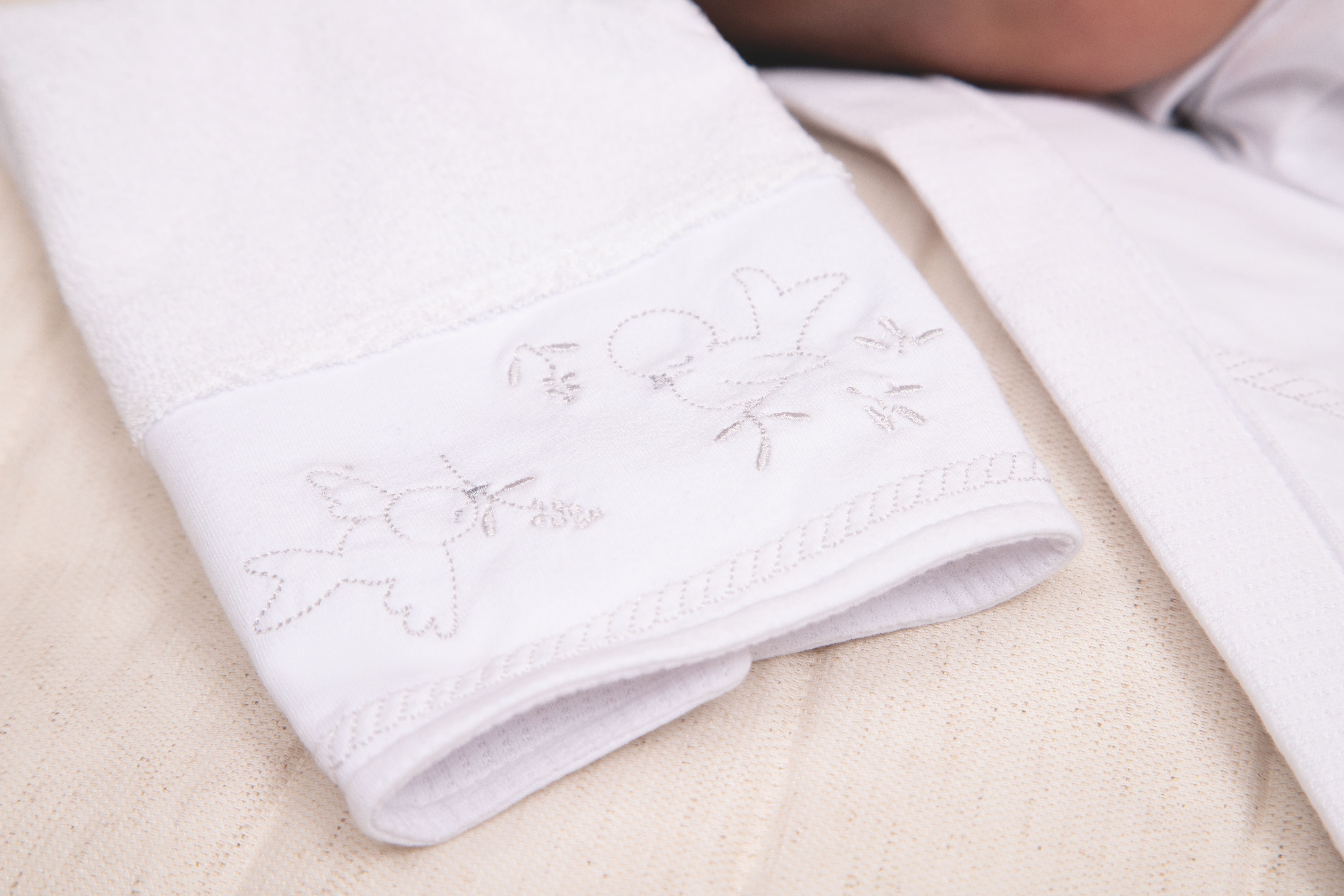 A babita forrada em atoalhado com bordado delicado completa o visual com um toque de ternura, ideal para cerimônias e batizados. O saquinho de tule é perfeito para armazenar o kit com cuidado e carinho.