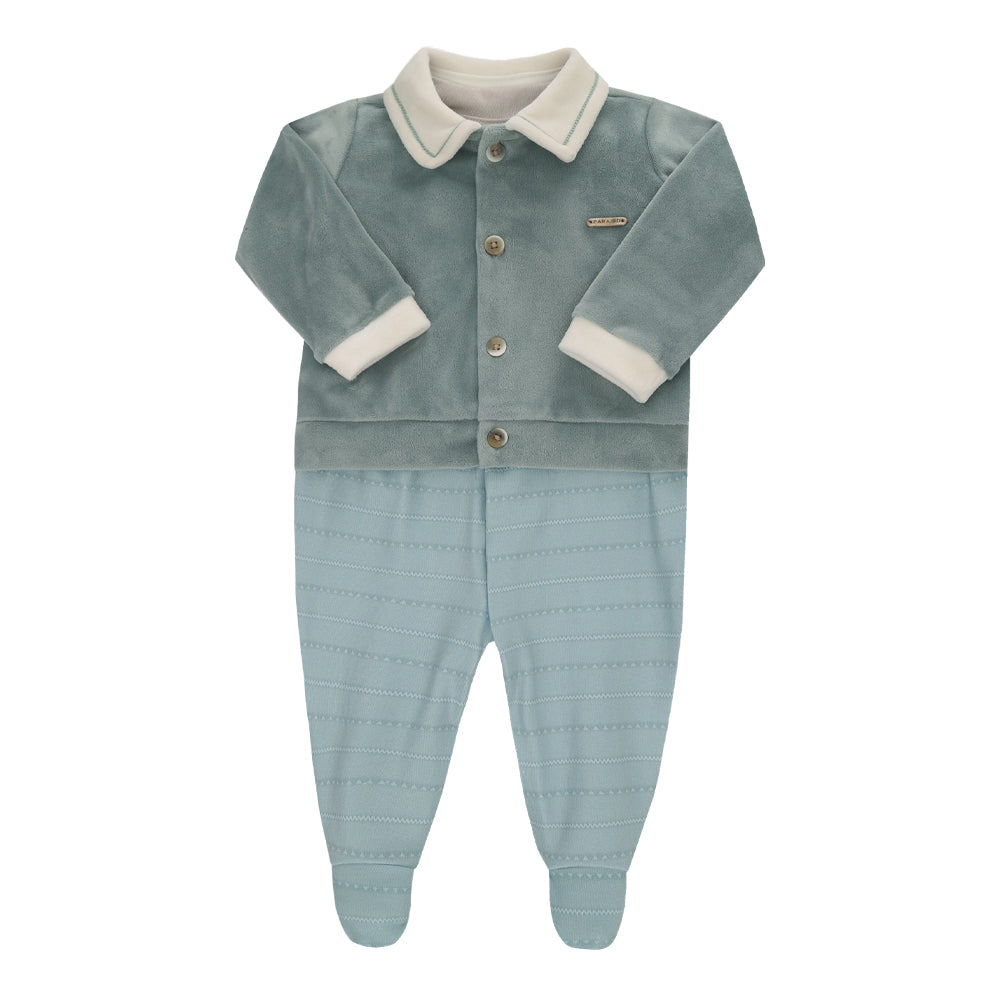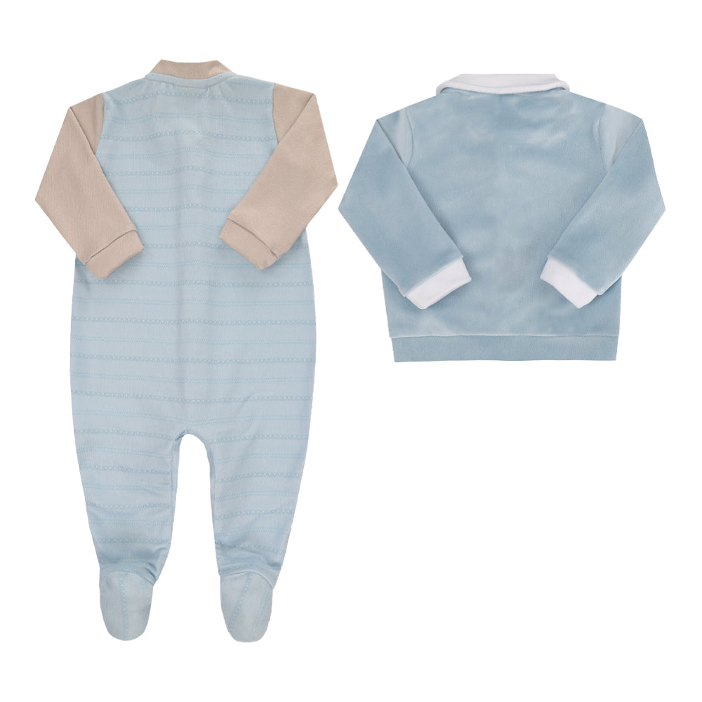 Mantenha seu bebê quentinho e estiloso nos dias mais frios com este lindo kit de macacão e casaco. O macacão longo é confeccionado em malha tricô levíssima, proporcionando toque suave e conforto extremo. Possui detalhes bordados, estampa delicada e abertura frontal até os pés, com botões de casinha e tic-tac invisível, garantindo praticidade na hora de vestir.