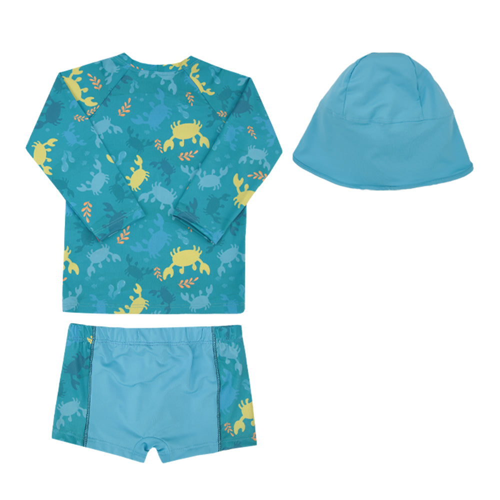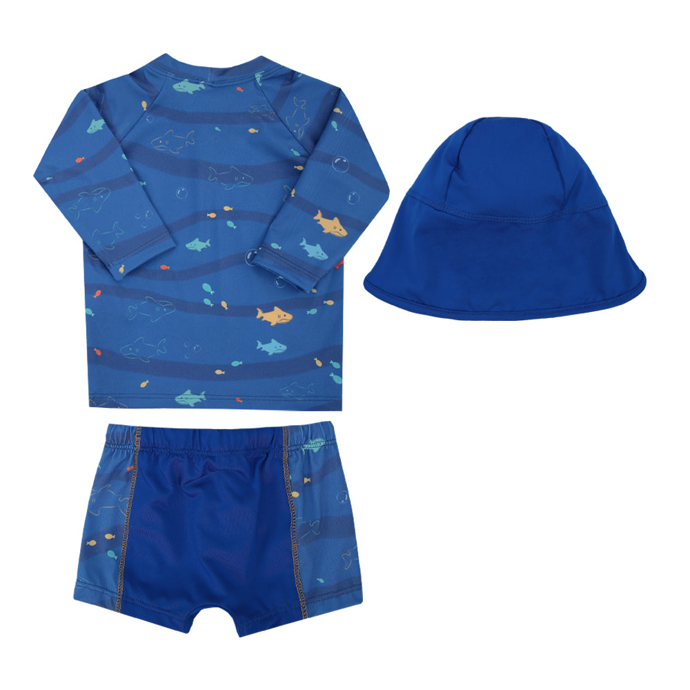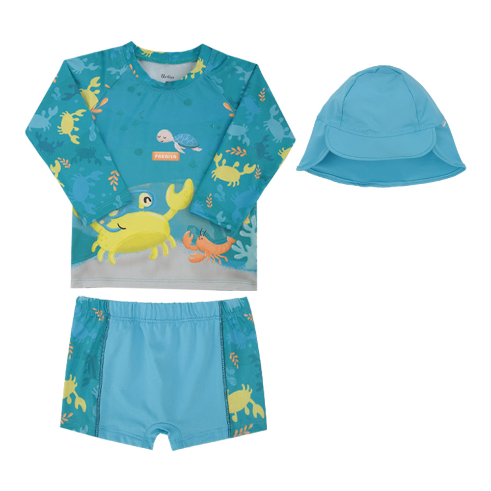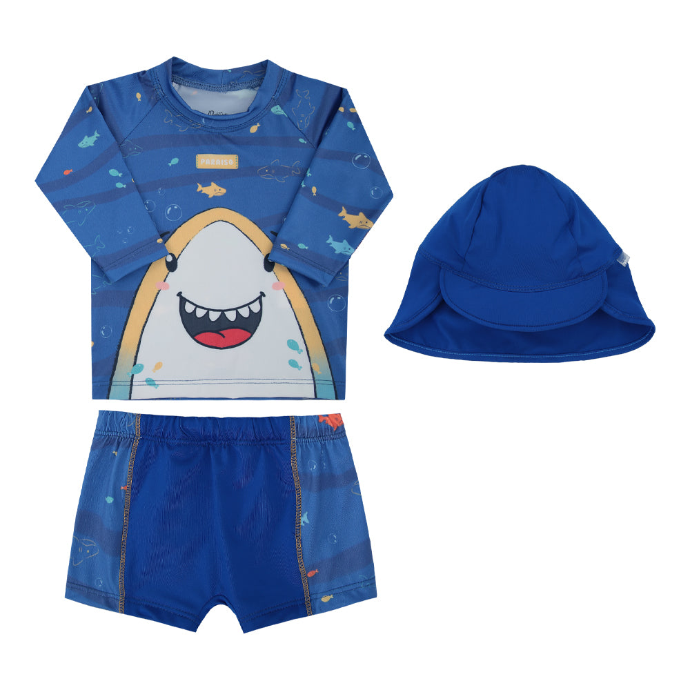 Kit praia linha tradicional com proteção UV 50+, blusa manga longa, sunga com forro e secagem rápida, chapéu incluso, materiais leves, detalhes estampados e cordão regulável.