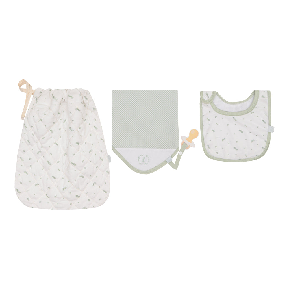 Kit bebê Letut com saquinho, babador e naninha em malha polifiado. Conforto e praticidade com acabamento delicado, prendedor de chupeta e bordados personalizados. Ideal para enxoval ou presente.