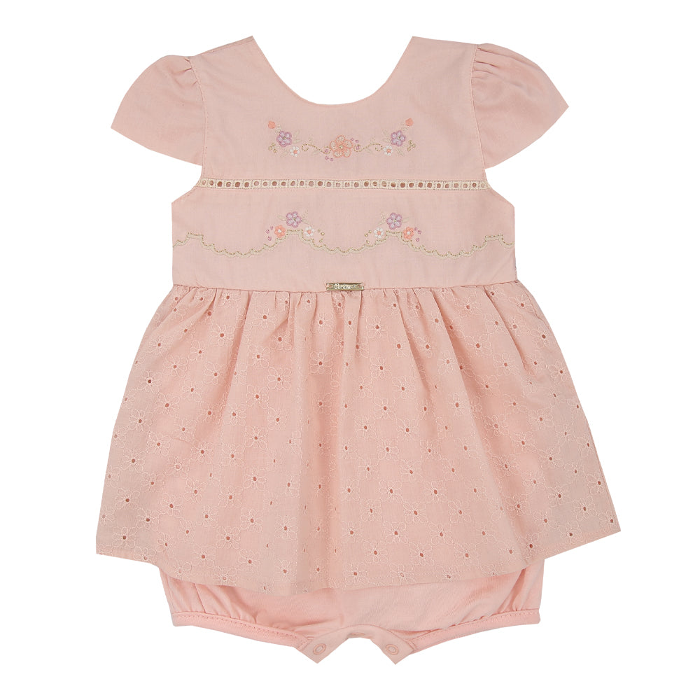 Macacão curto em meia malha 100% algodão, com detalhes em cambraia, broderie e bordados delicados. Leve, sofisticado e confortável, é ideal para ocasiões especiais com muito charme.