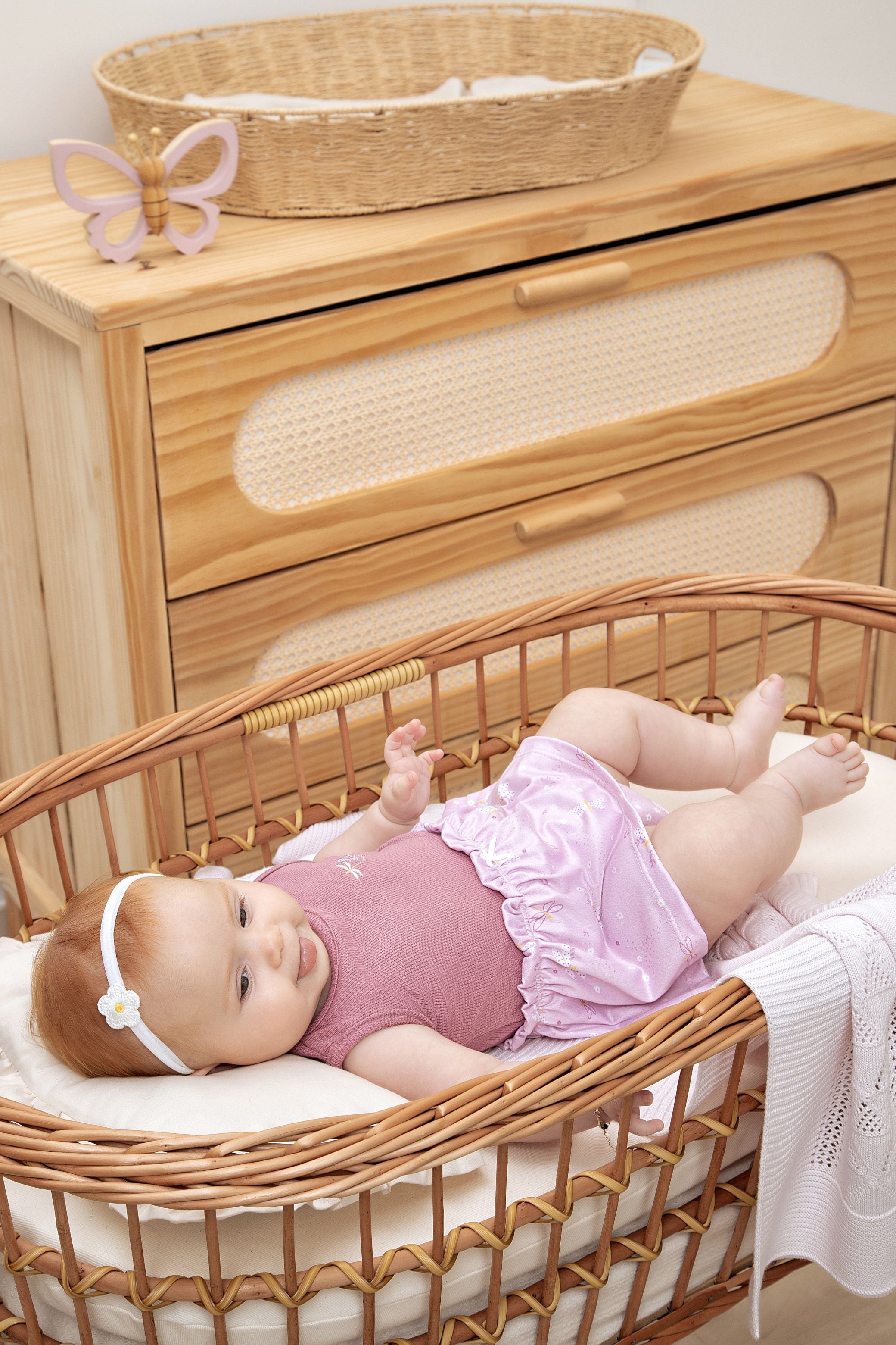 Os detalhes bordados e o lacinho decorativo deixam a peça ainda mais delicada e feminina. Com abertura em botão de pressão, garante praticidade para as trocas. Uma escolha charmosa para compor o enxoval ou para momentos especiais do dia a dia.