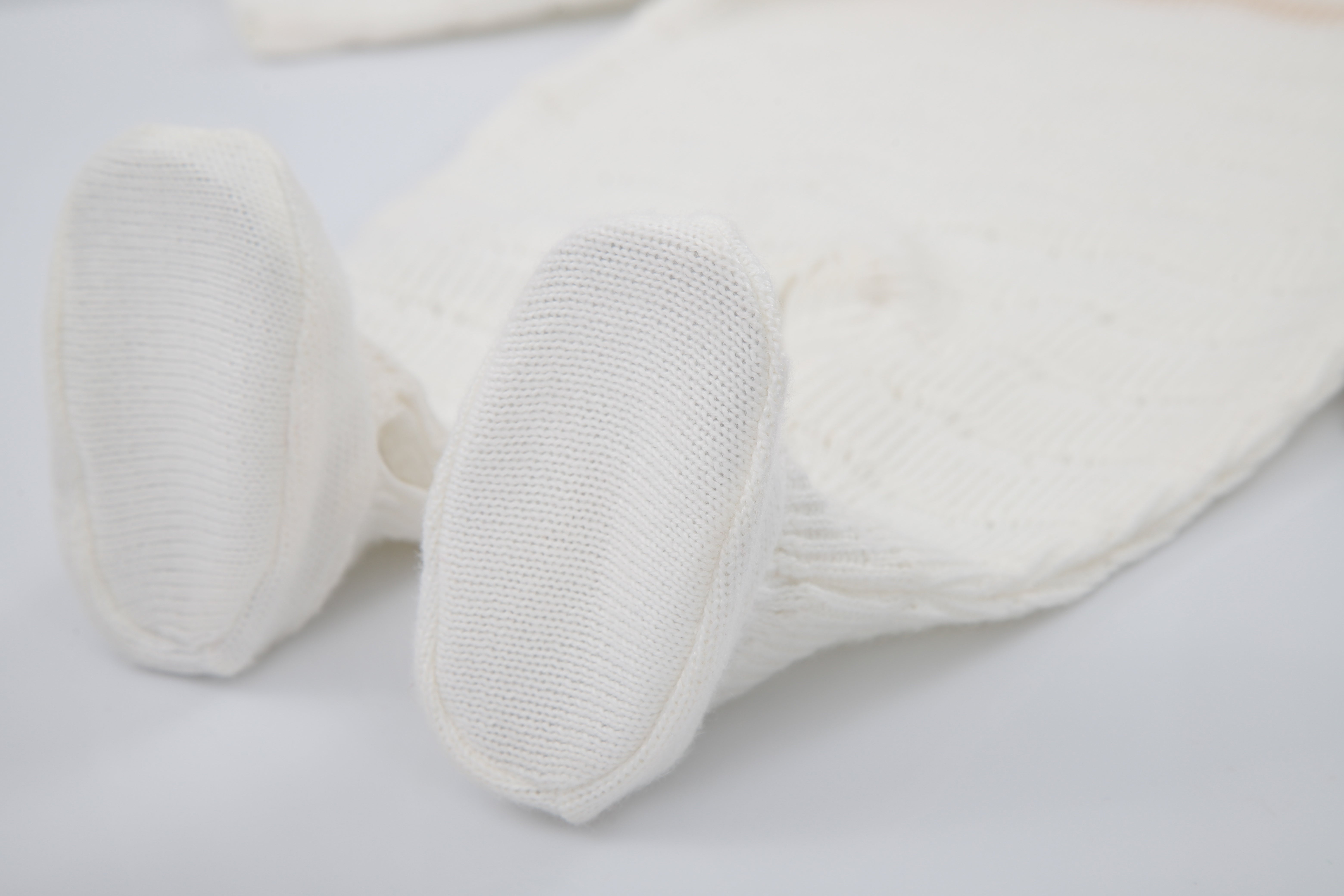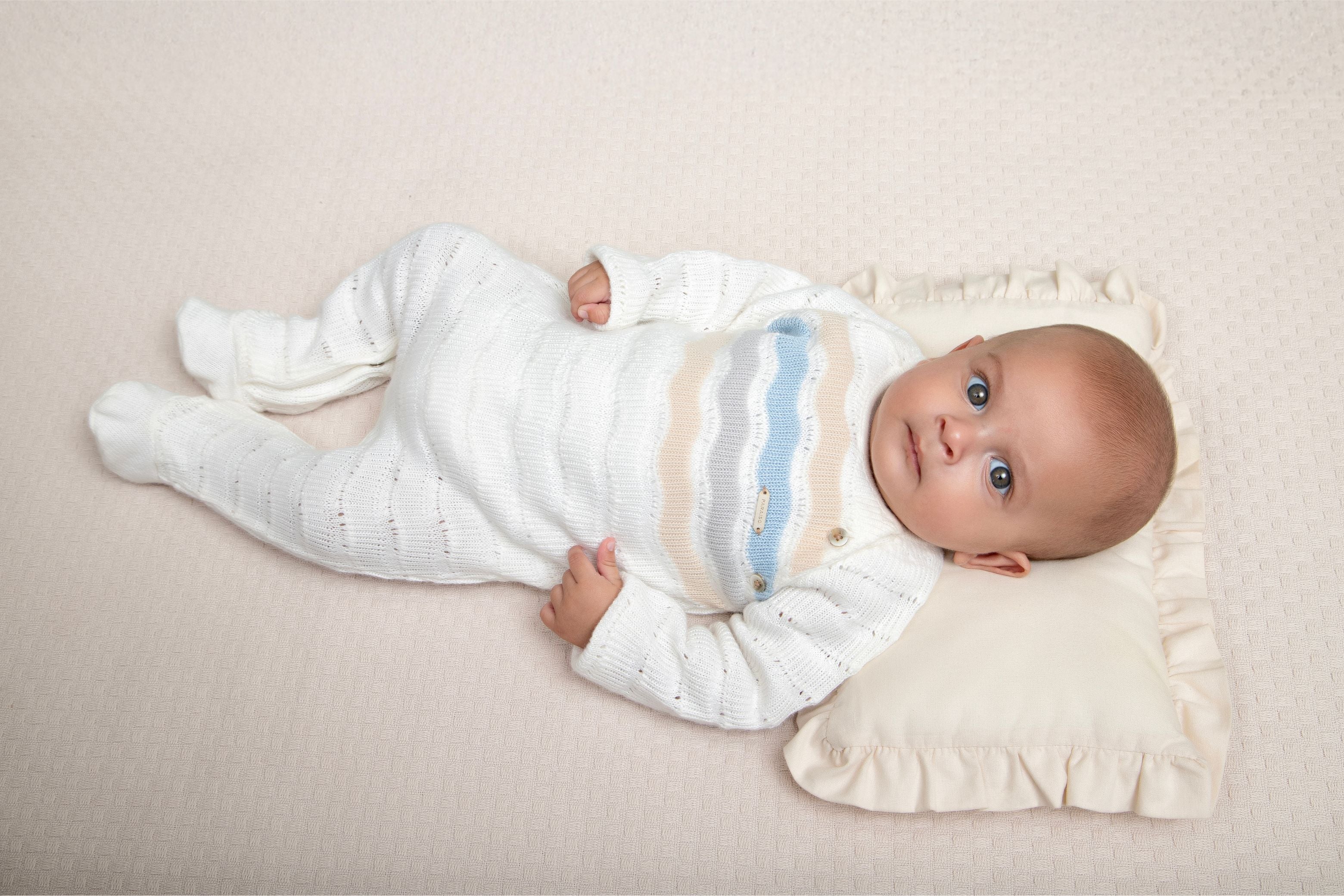 Este macacão longo em tricô trabalhado encanta pelo toque macio e texturizado, ideal para os dias mais frescos. Com abertura lateral por botões e fundo com botão de pressão invisível, garante praticidade e conforto durante as trocas.