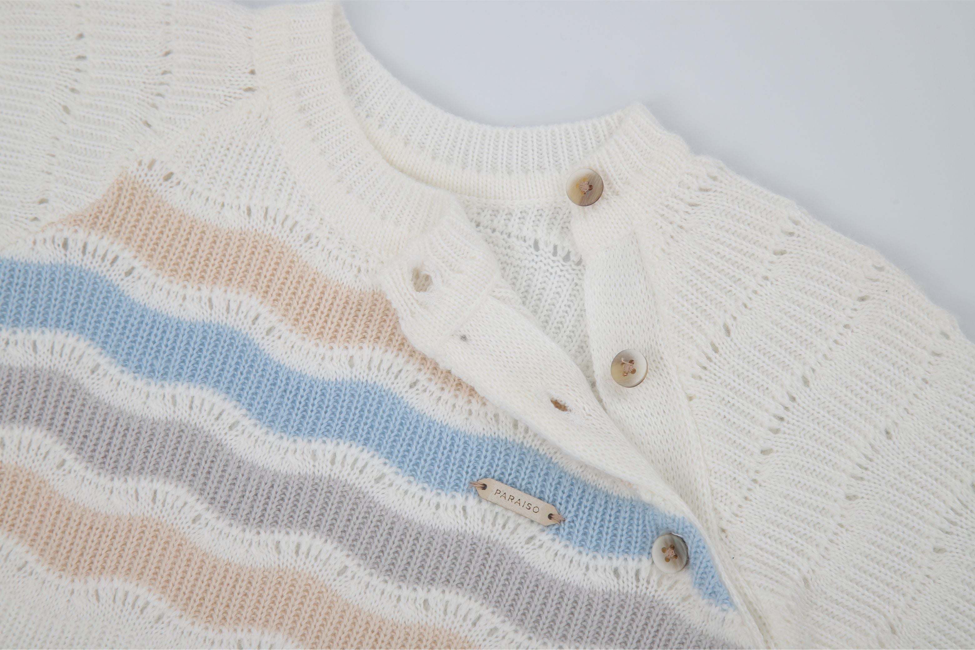 Lavar à mão com sabão neutro. Não usar alvejante. Não torcer. Secar na horizontal e à sombra. Passar o body em temperatura baixa. Não passar o tricô. Não limpar a seco. Evite máquina de lavar e secar para preservar a textura delicada das peças.