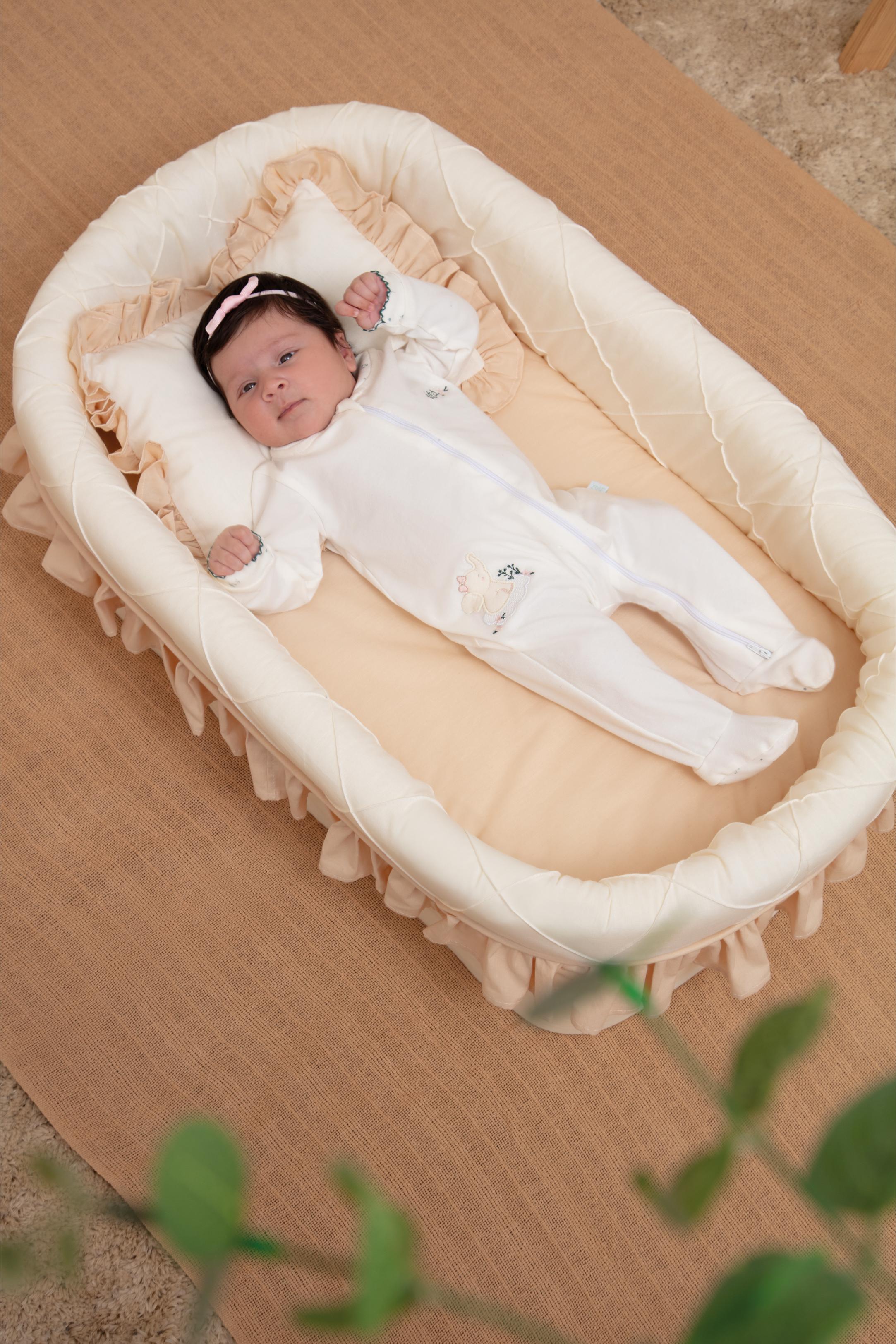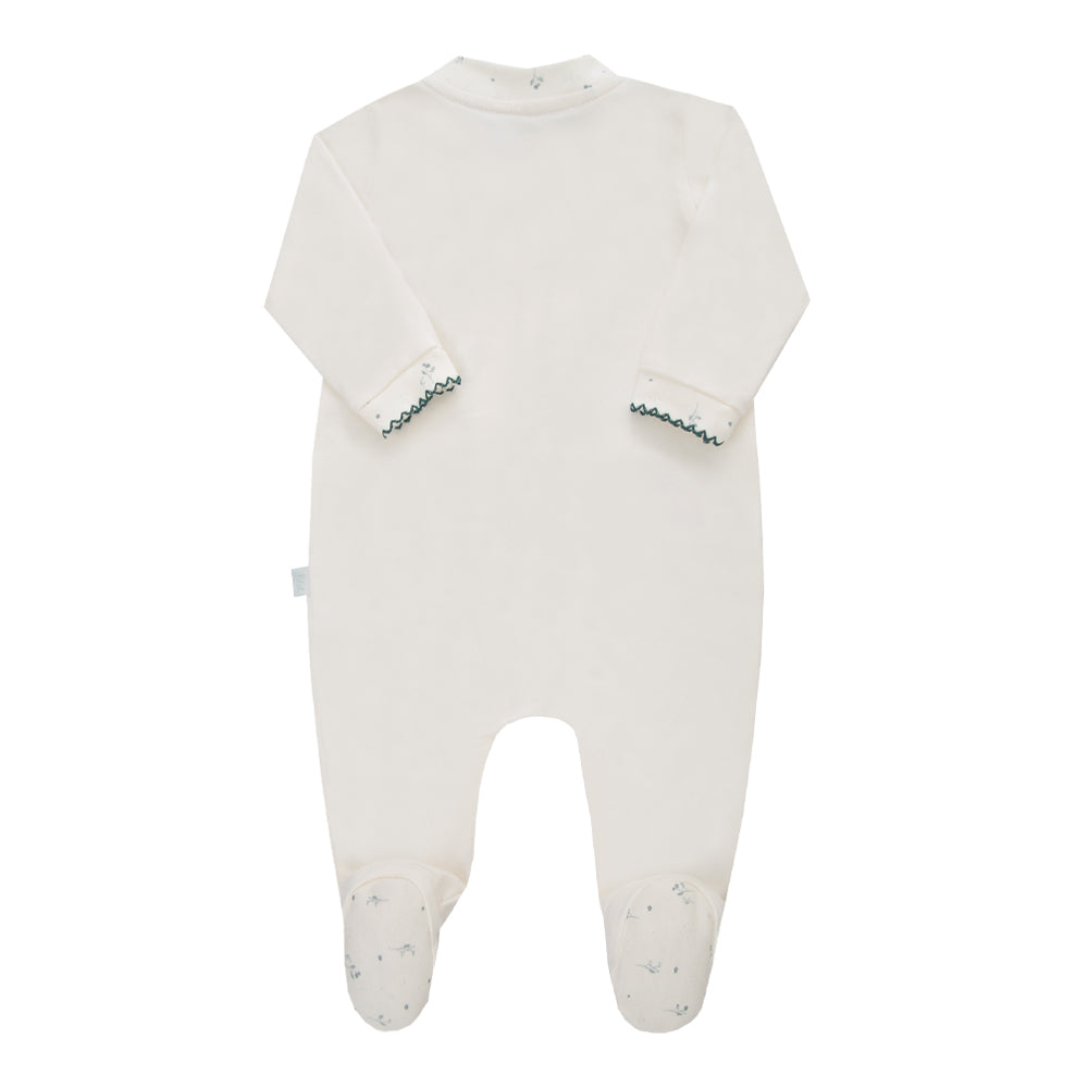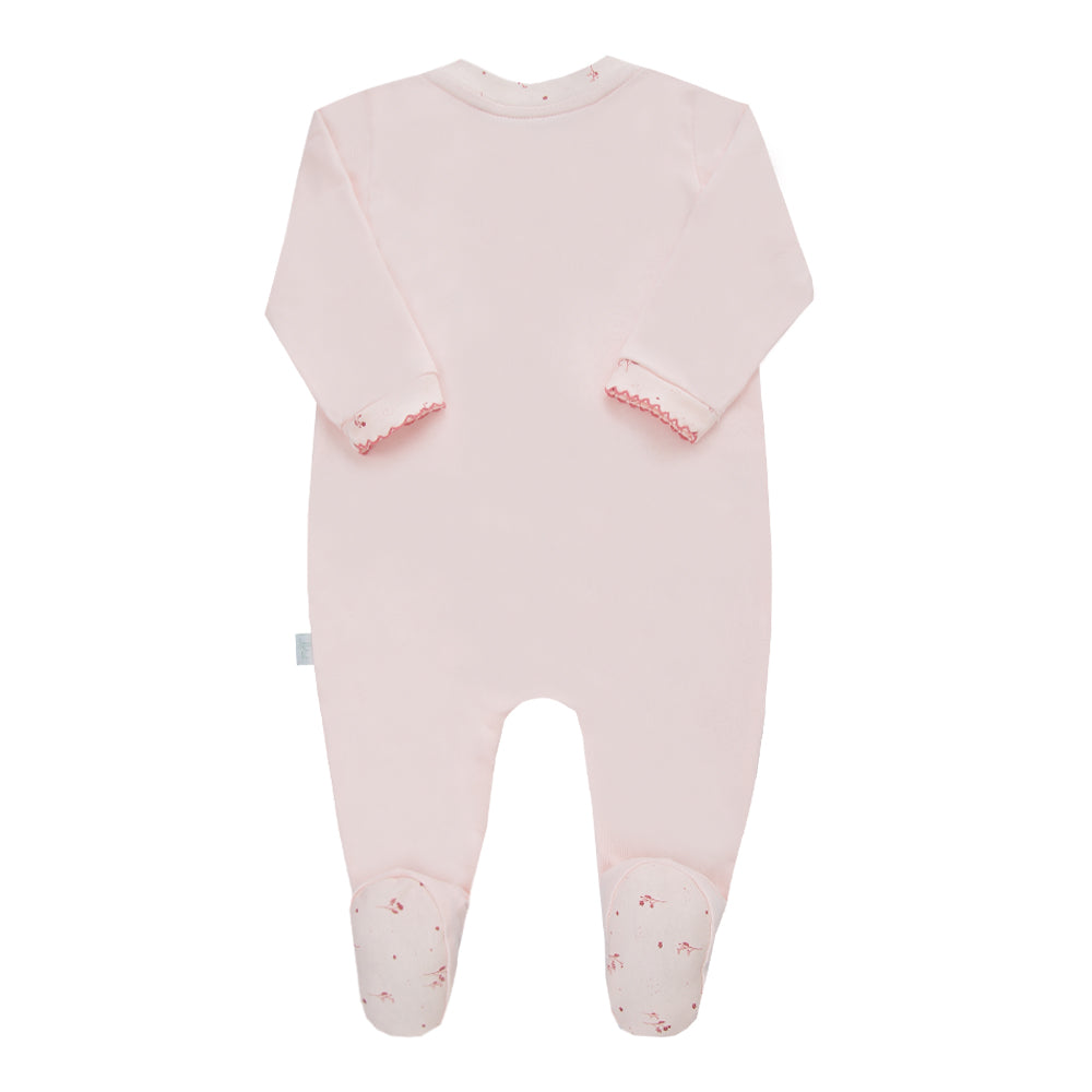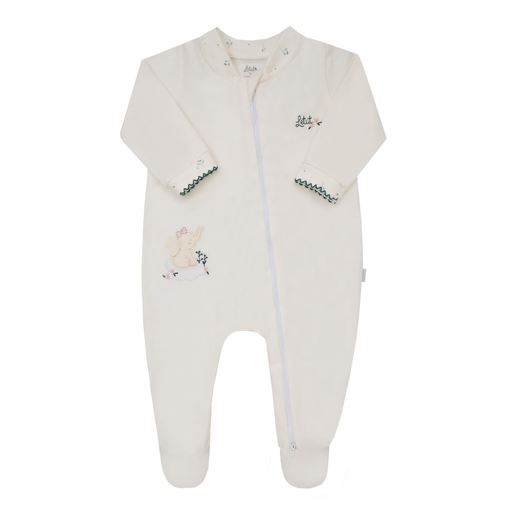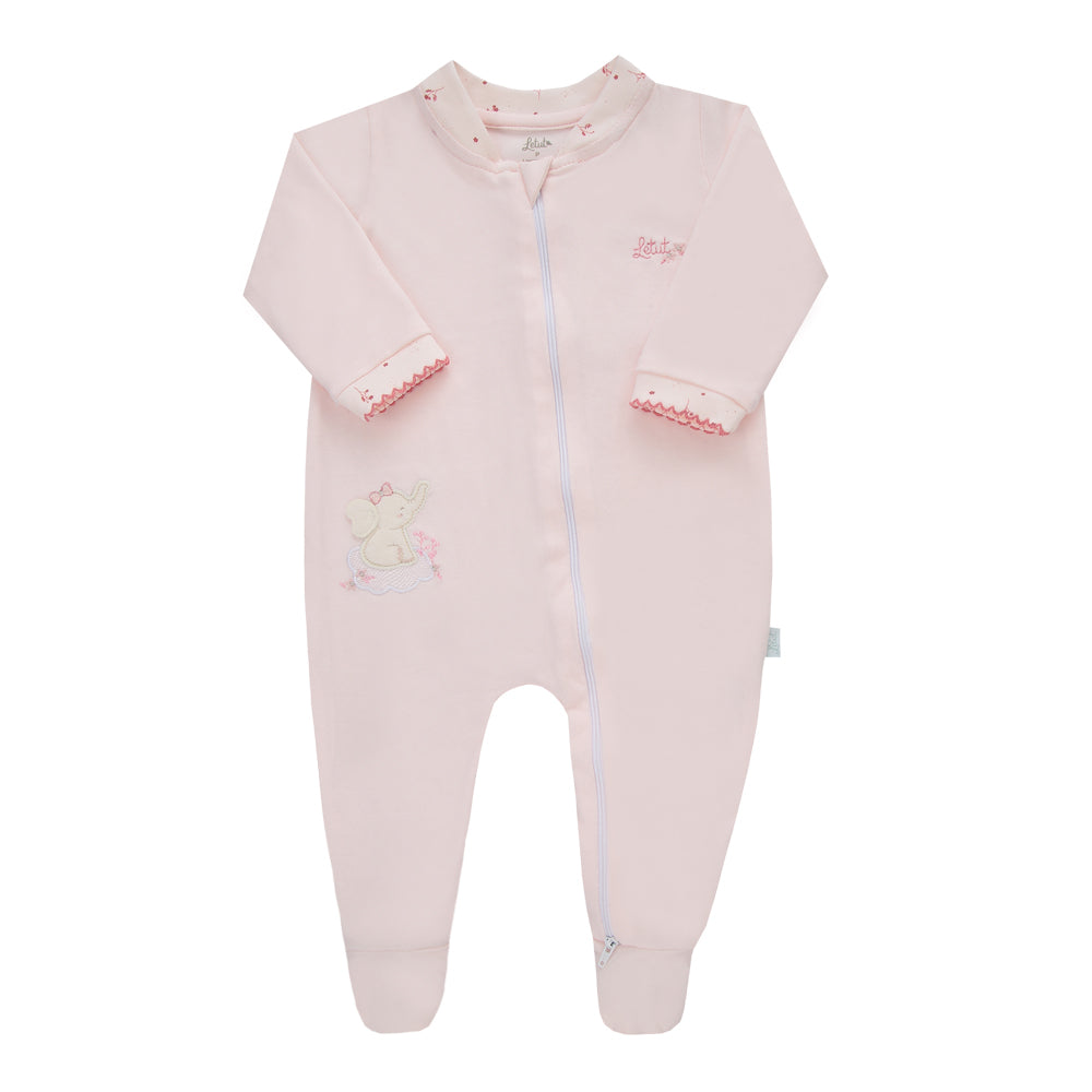 Um macacão delicado e funcional, com zíper duplo, bordado de elefantinha e detalhes em picueta, perfeito para manter sua bebê confortável e charmosa na meia estação.