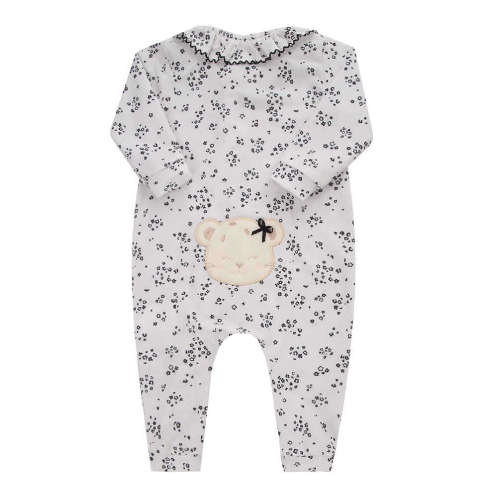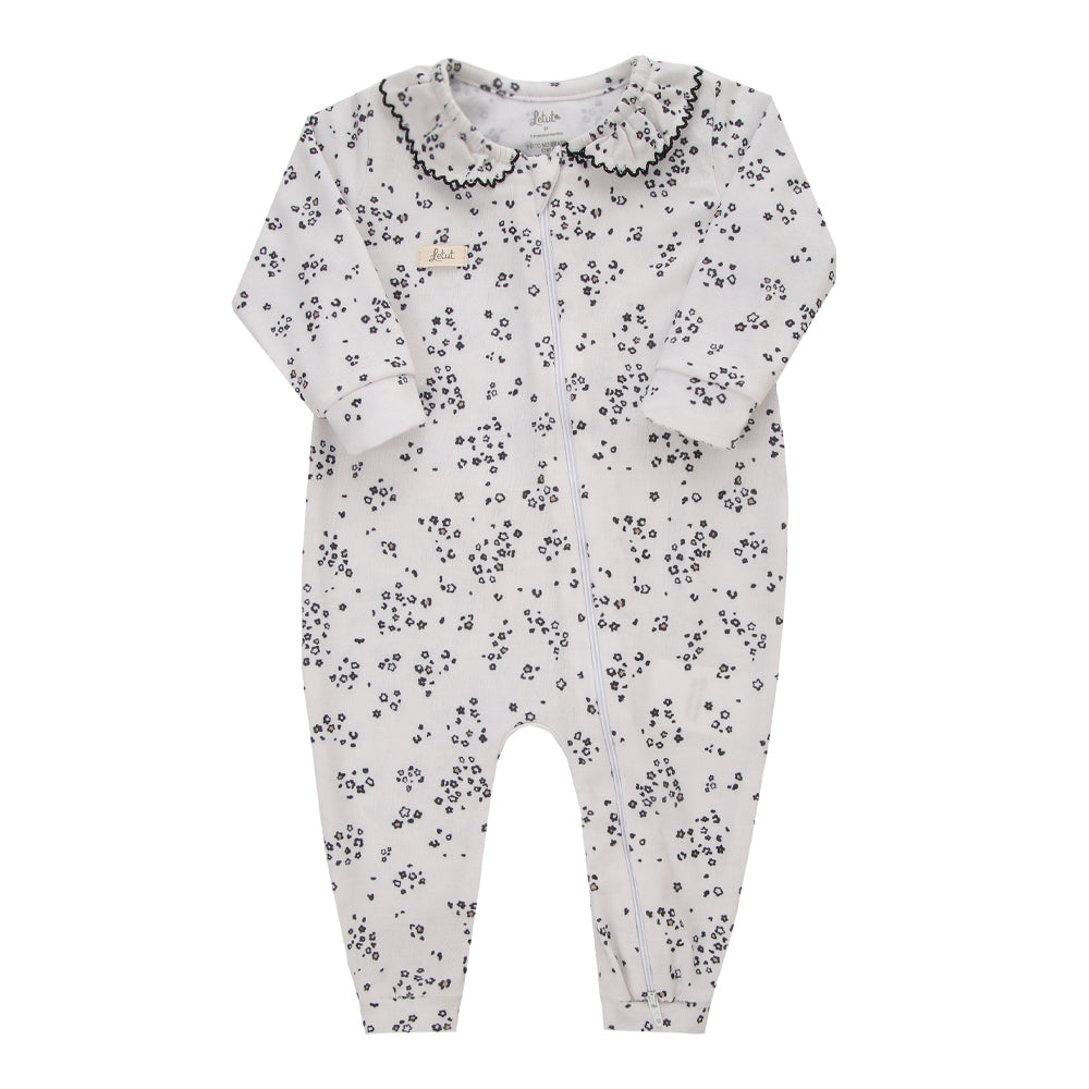 Um macacão delicado e prático, com zíper duplo, bordado lúdico no bumbum e gola em picueta, perfeito para deixar sua bebê confortável e estilosa em qualquer ocasião.