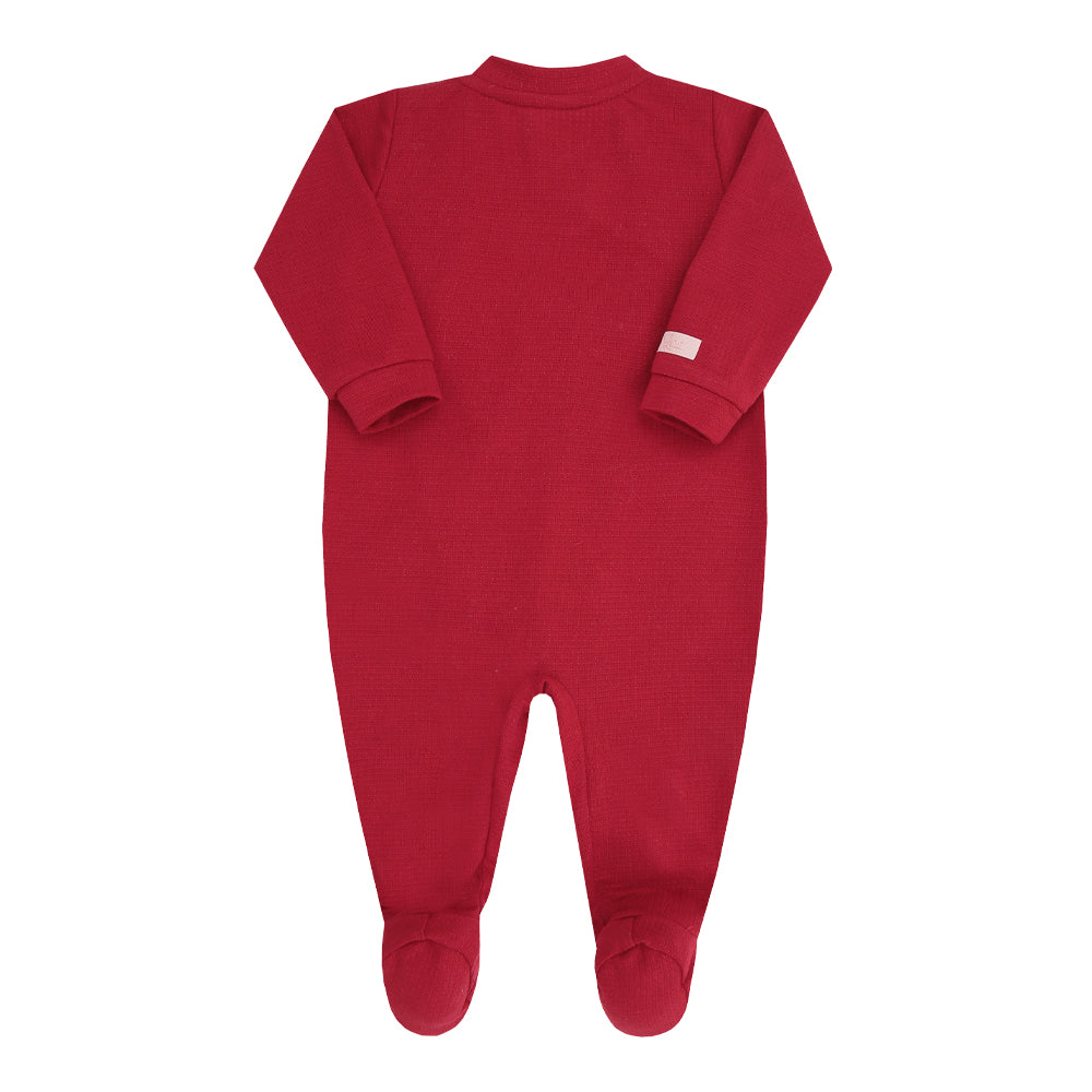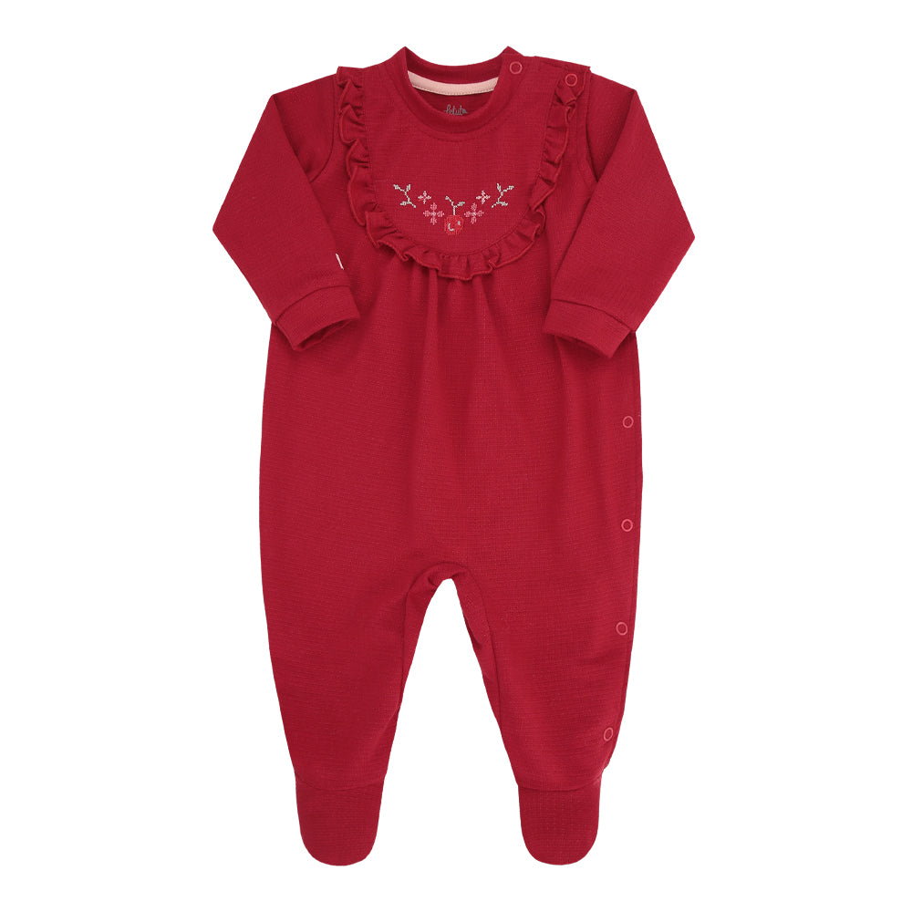 Macacão feminino em malha texturizada, com bordado ponto cruz e babado delicado. Confortável e charmoso, ideal para meia estação. Disponível nas cores Vermelho e Lavanda.