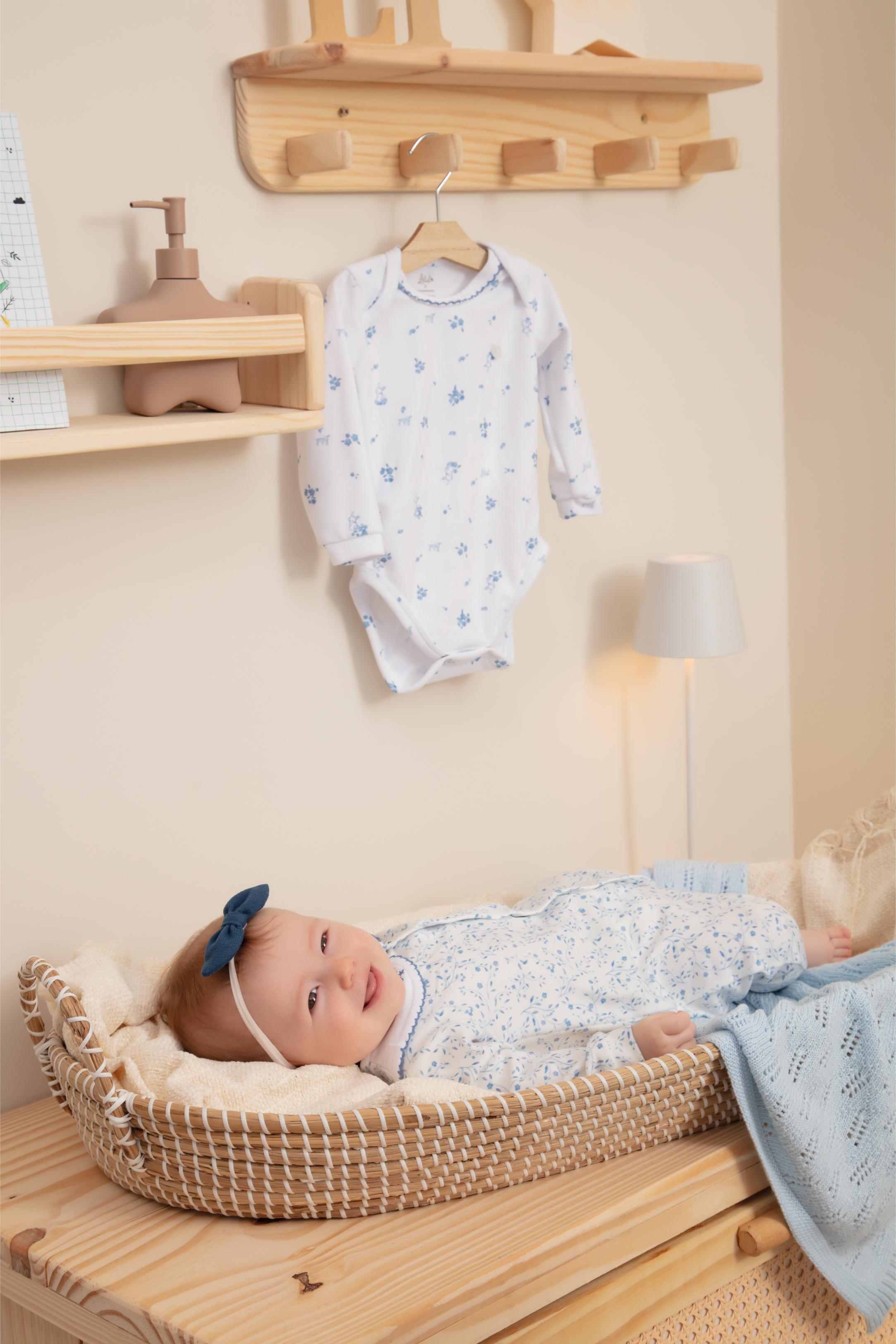 Confeccionado em malha tricô levíssima estampada, proporciona um toque suave, aveludado e super confortável, perfeito para a pele delicada da bebê. O design é complementado por um delicado bordado na gola, acabamento em picueta e um lacinho em fita de cetim, que adiciona um toque extra de elegância.