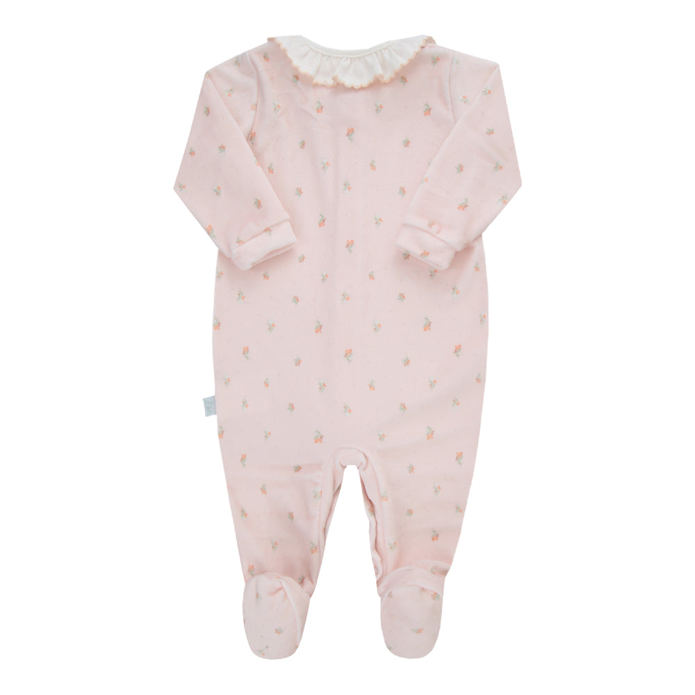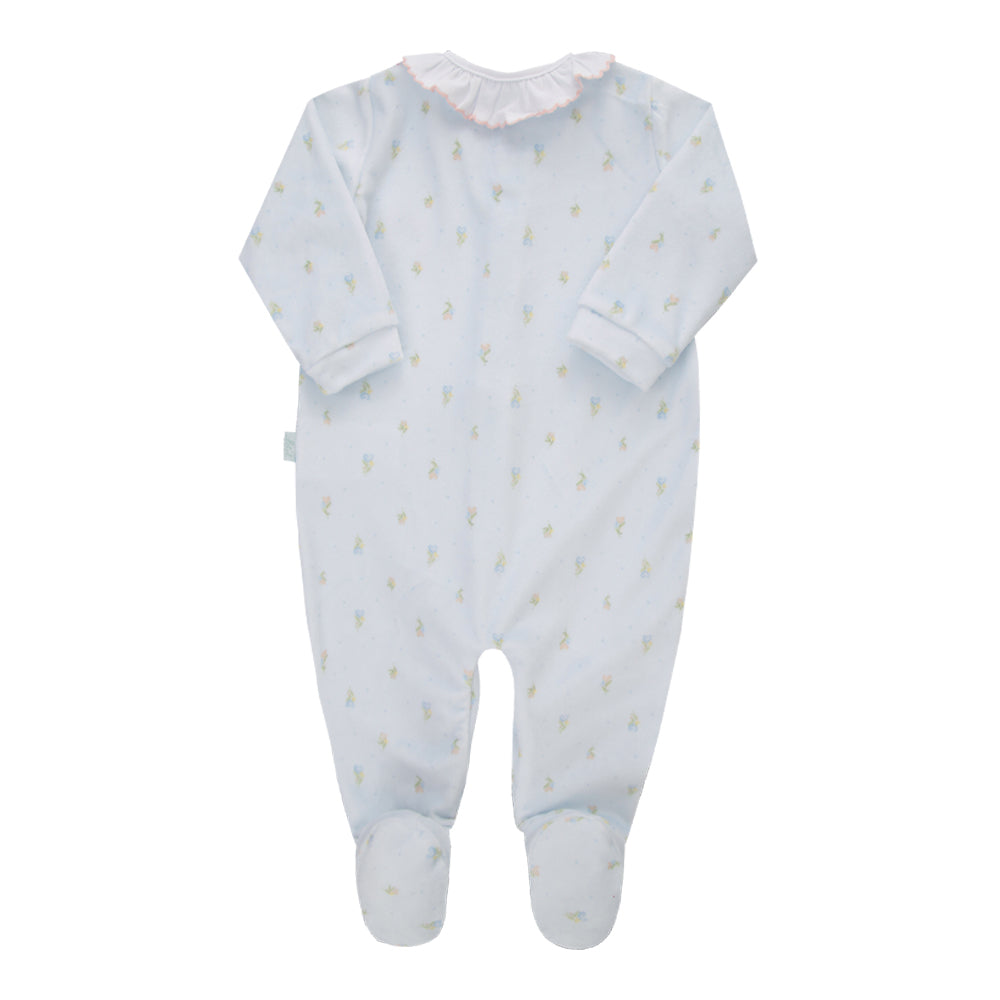 Feito em plush estampado super macio e aveludado, esse macacão garante um toque suave à pele sensível do bebê. A gola em malha com contorno de babadinho picueta efeito crochê traz um detalhe clássico e encantador, combinando perfeitamente com o laço e pingente personalizado da marca no peitinho.