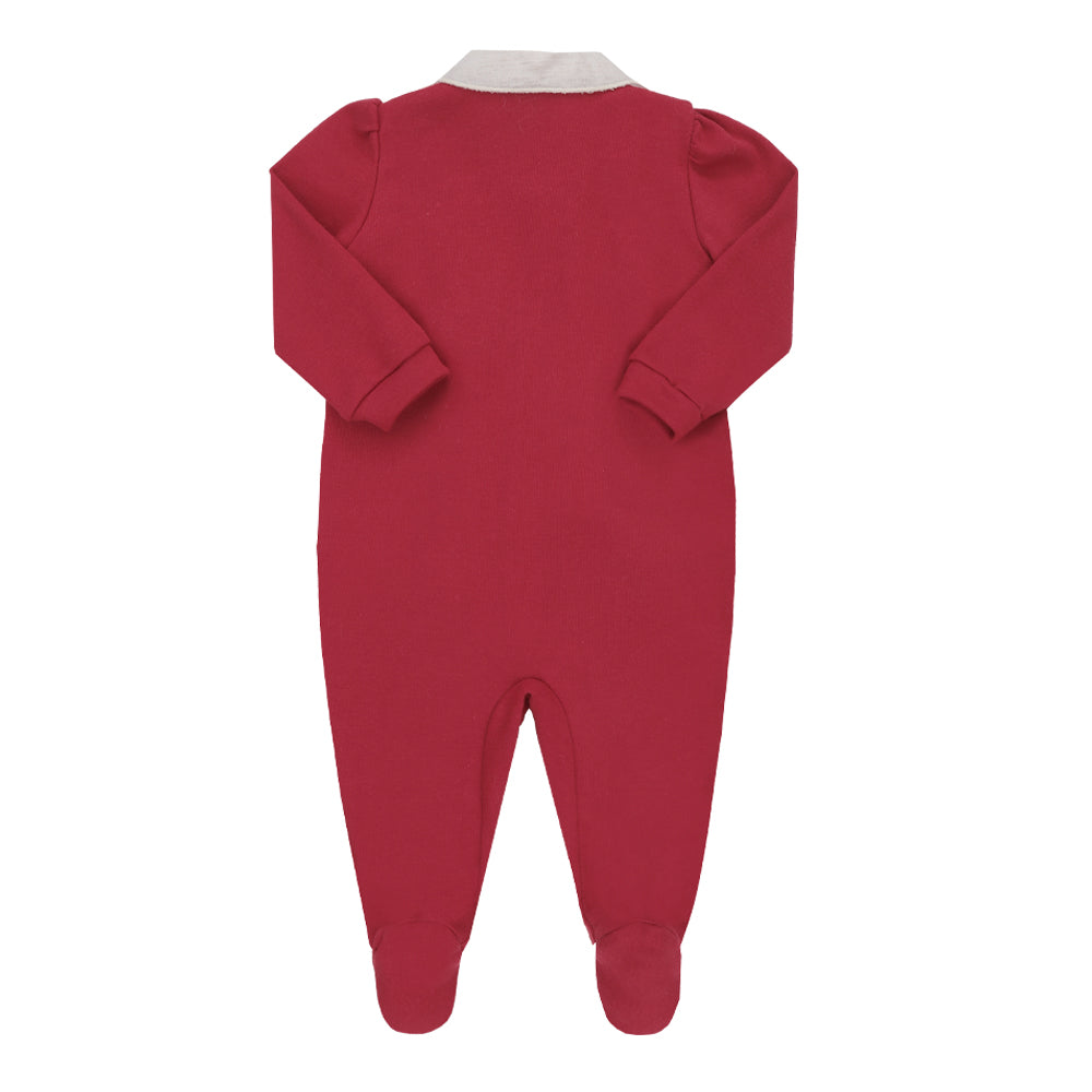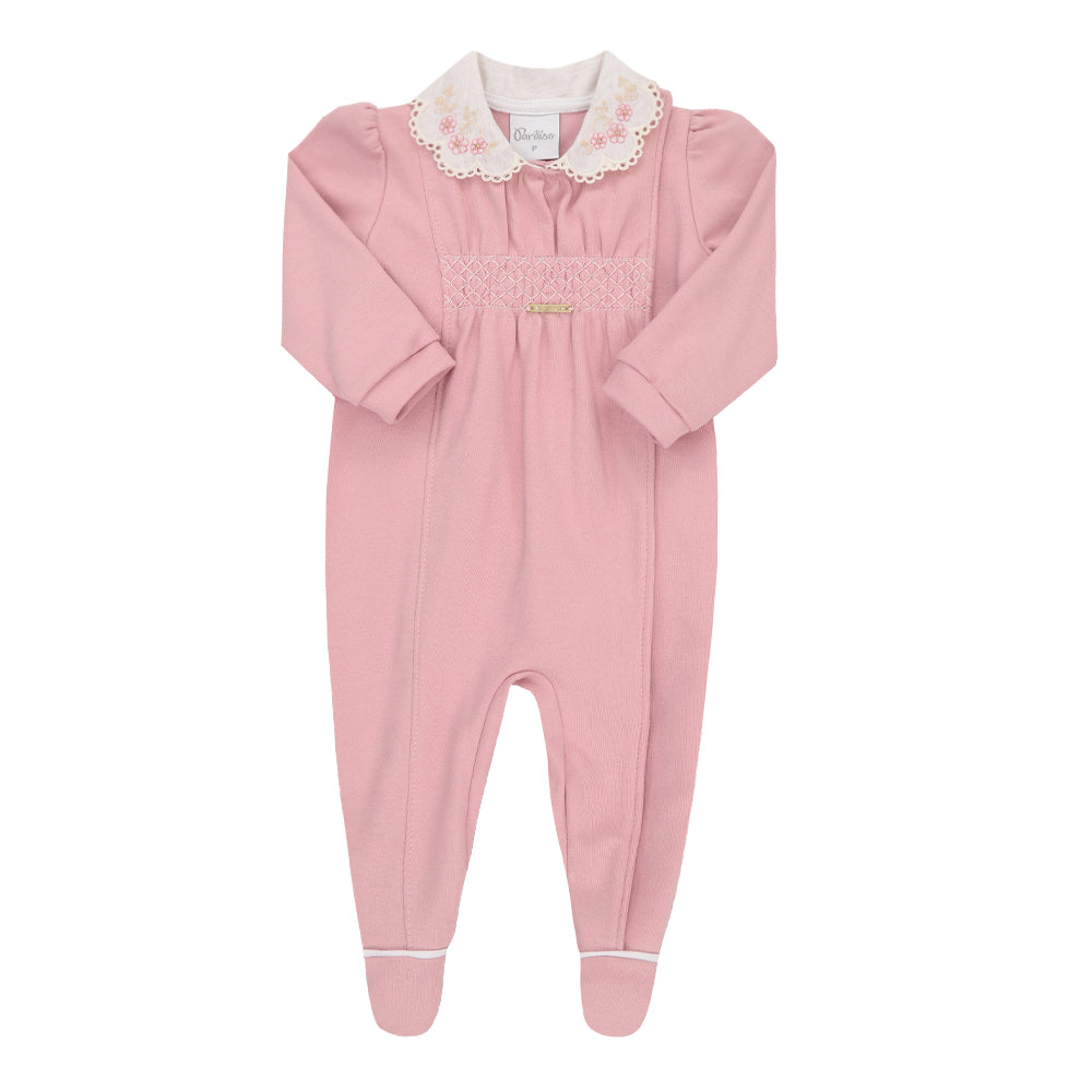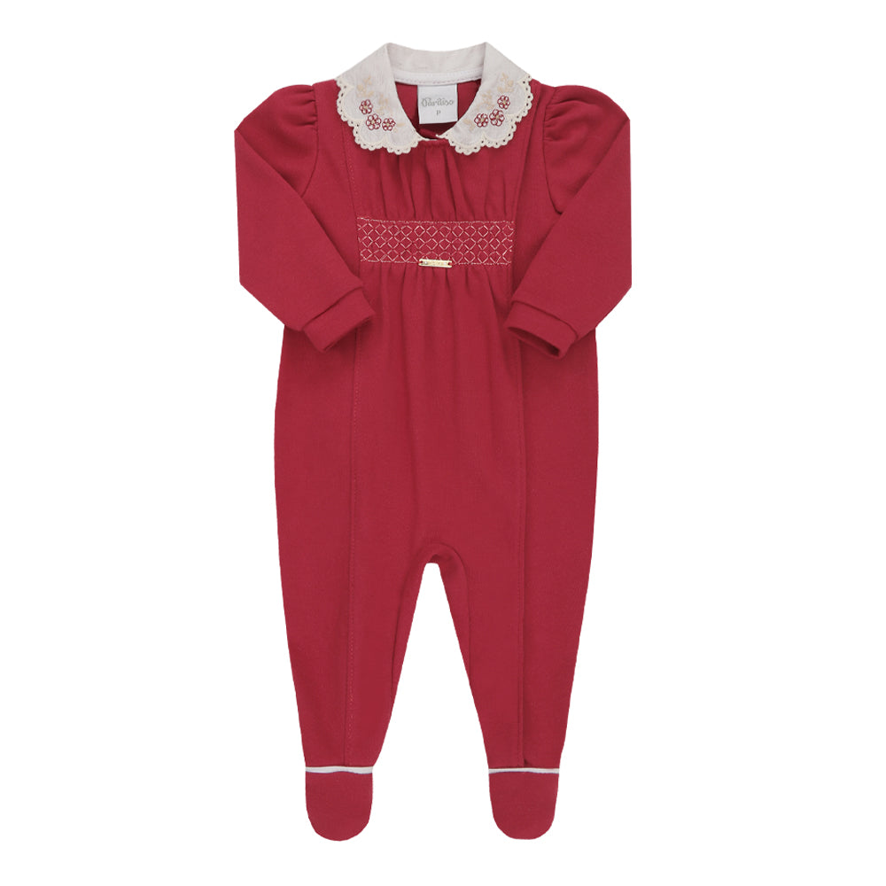Seu design delicado conta com franzido no peito e bordado sobreposto, agregando sofisticação ao look. A gola bordada traz um charme extra, enquanto a abertura lateral com botões de pressão invisíveis facilita a troca de roupa. O detalhe do pezinho bico de pato garante ainda mais aconchego. Finalizado com a plaquinha personalizada da marca, esse macacão é uma opção encantadora para diversas ocasiões.