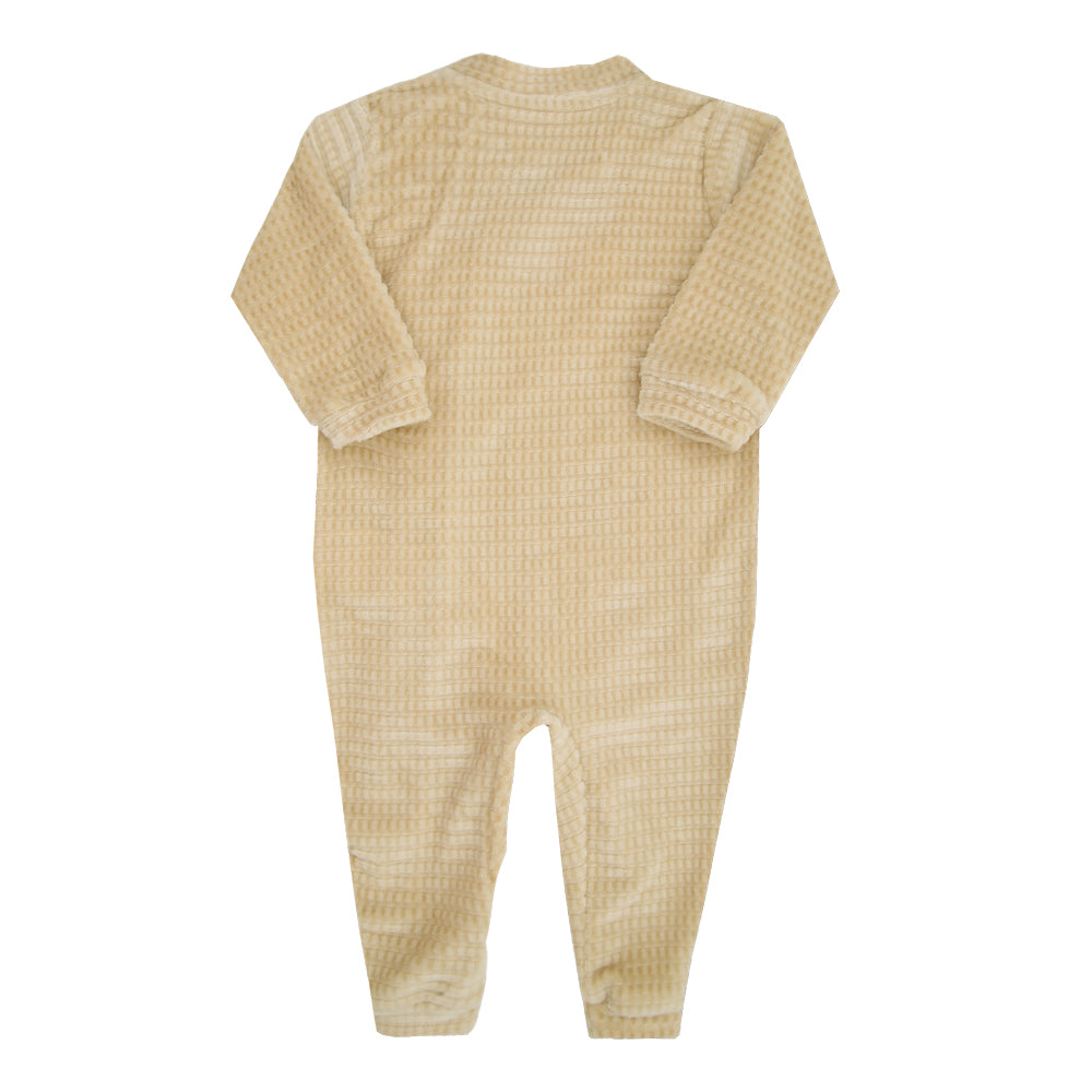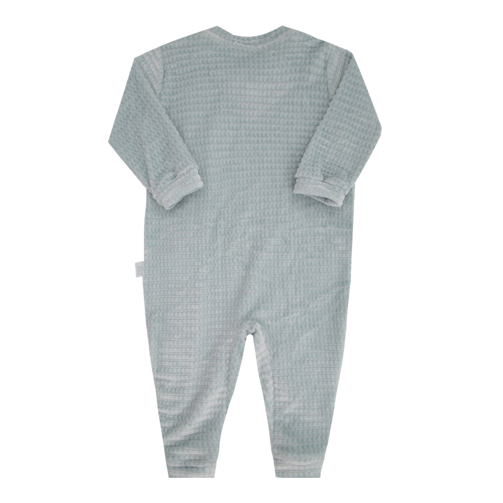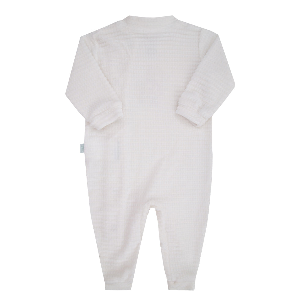 Macacão longo unissex em plush jacquard quadriculado com textura aveludada e bordados delicados. Abertura lateral com botões de pressão, punhos e gola do próprio tecido garantem conforto, praticidade.