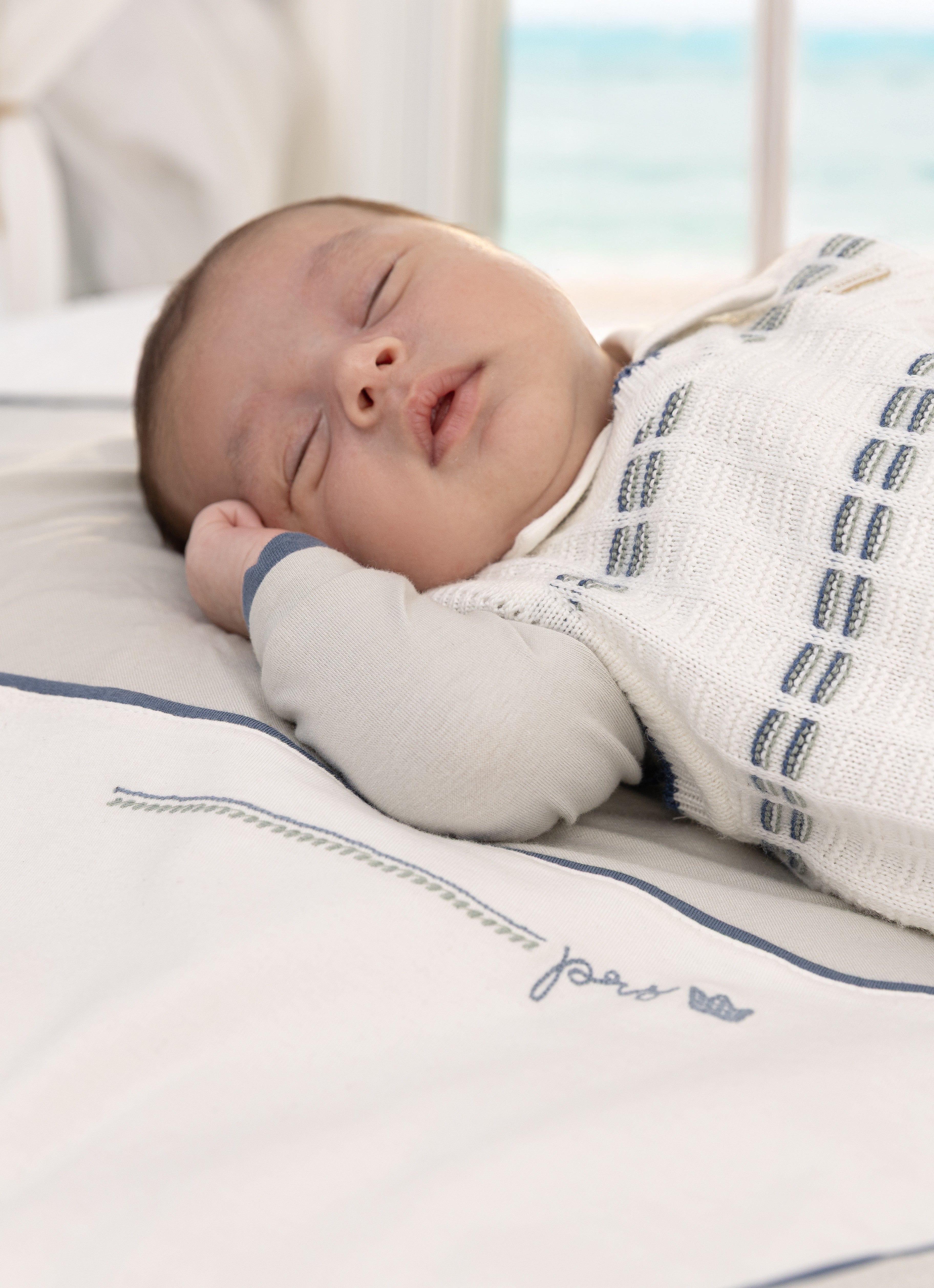 Acompanha uma manta bordada, perfeita para manter o bebê aconchegado, e um colete em tricô trabalhado leve e macio, com plaquinha personalizada da marca Paraiso, adicionando ainda mais elegância.