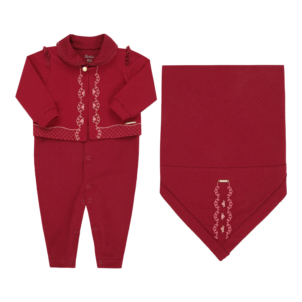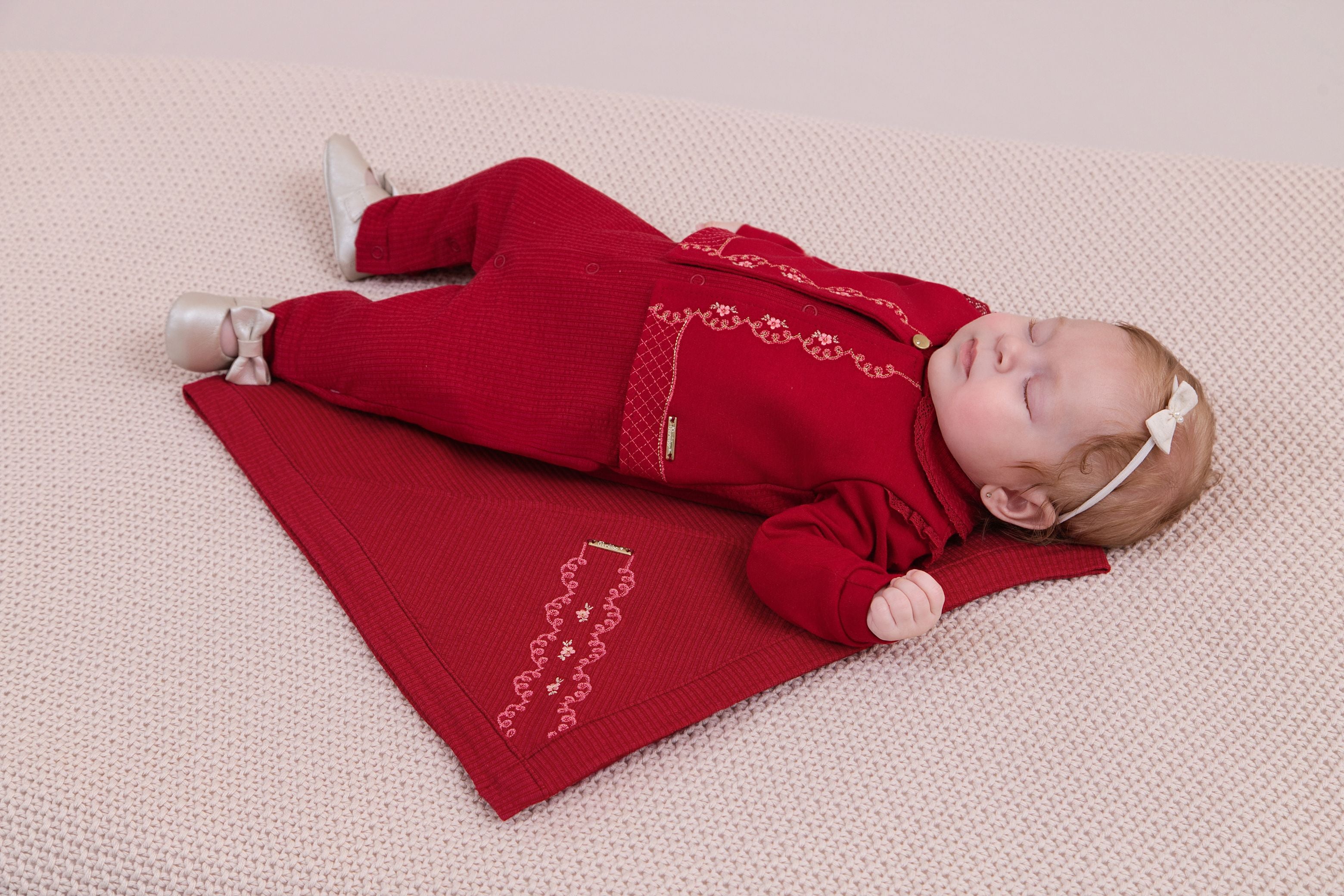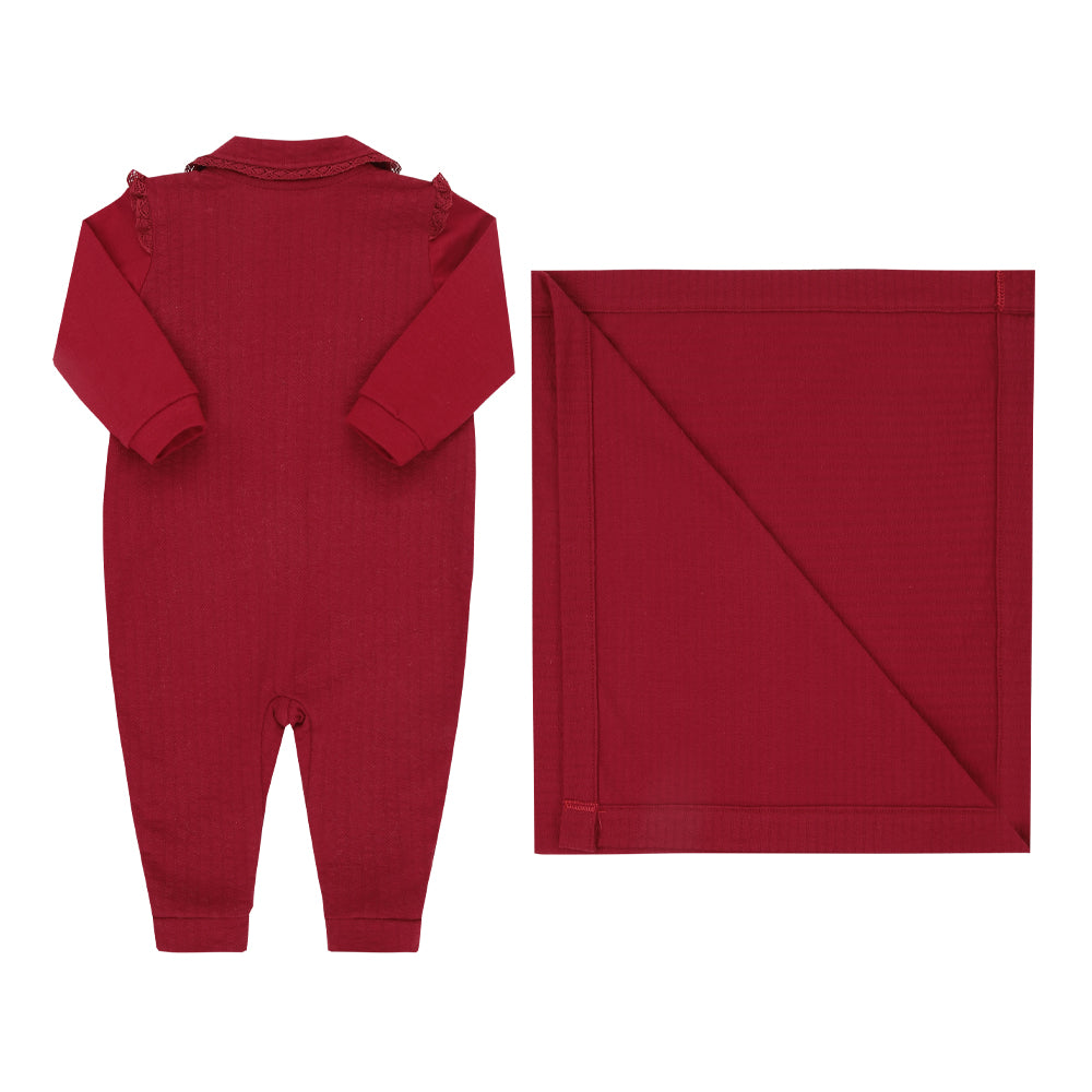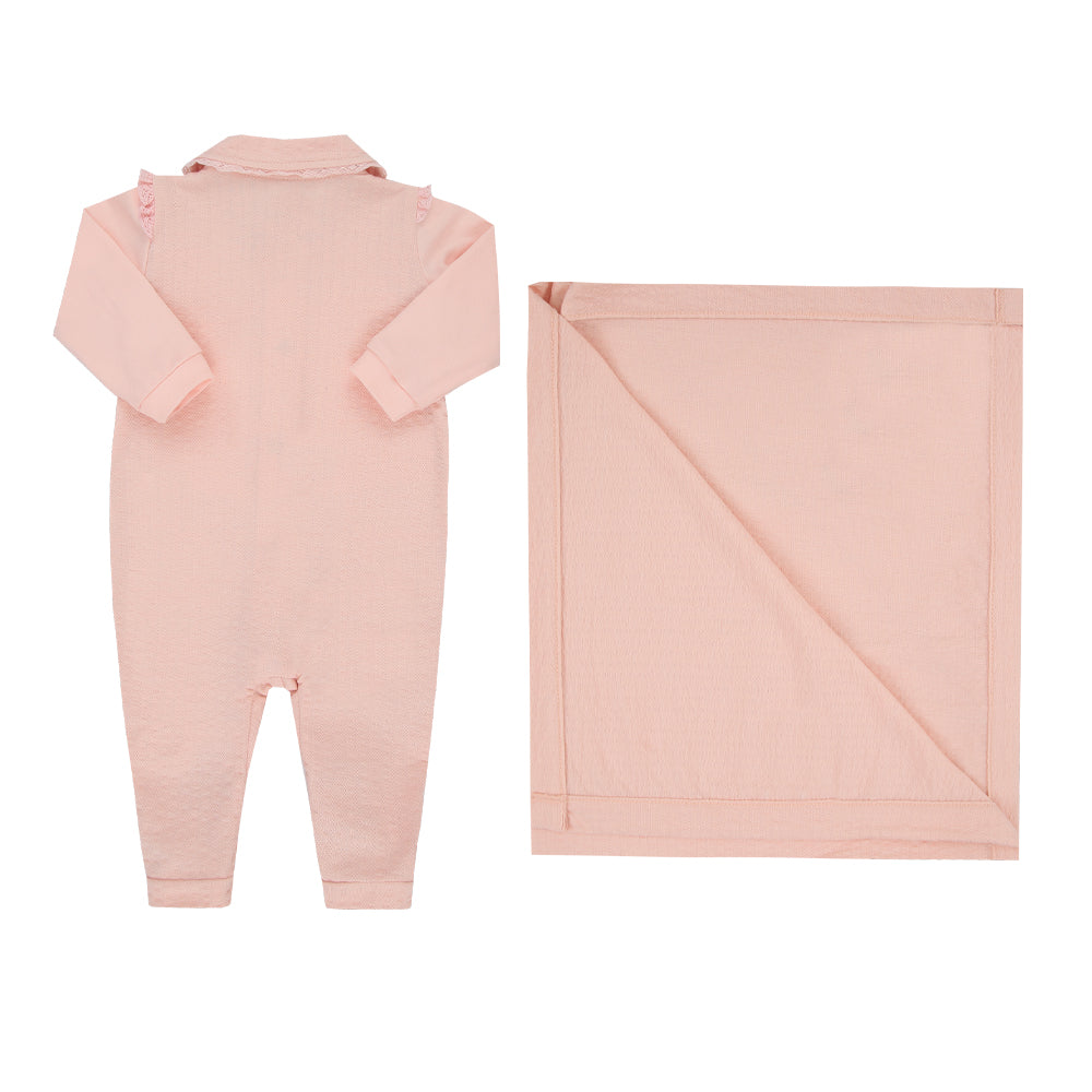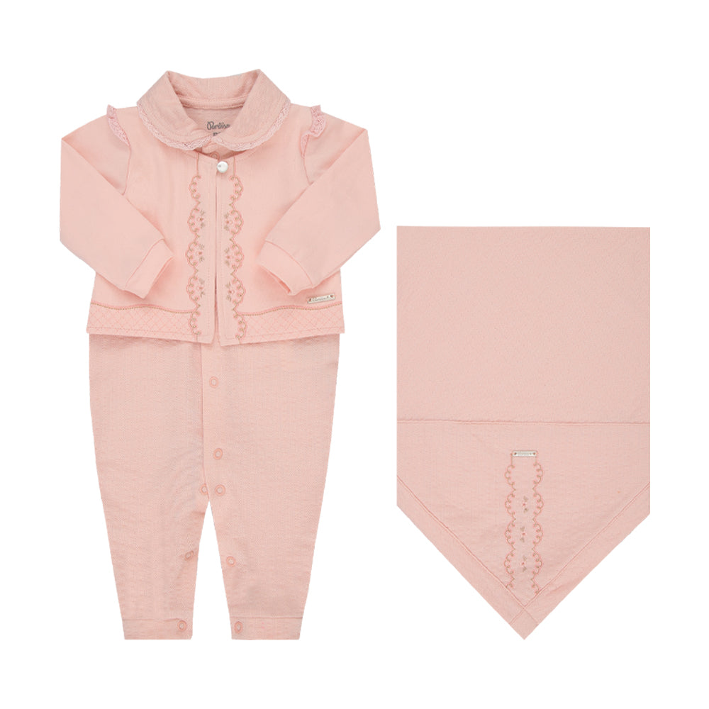 Conjunto em tricô canelado com toque macio, abertura frontal, detalhes de renda e bordado, casaco falso, plaquinha personalizada e manta com acabamento especial garantem charme e conforto.